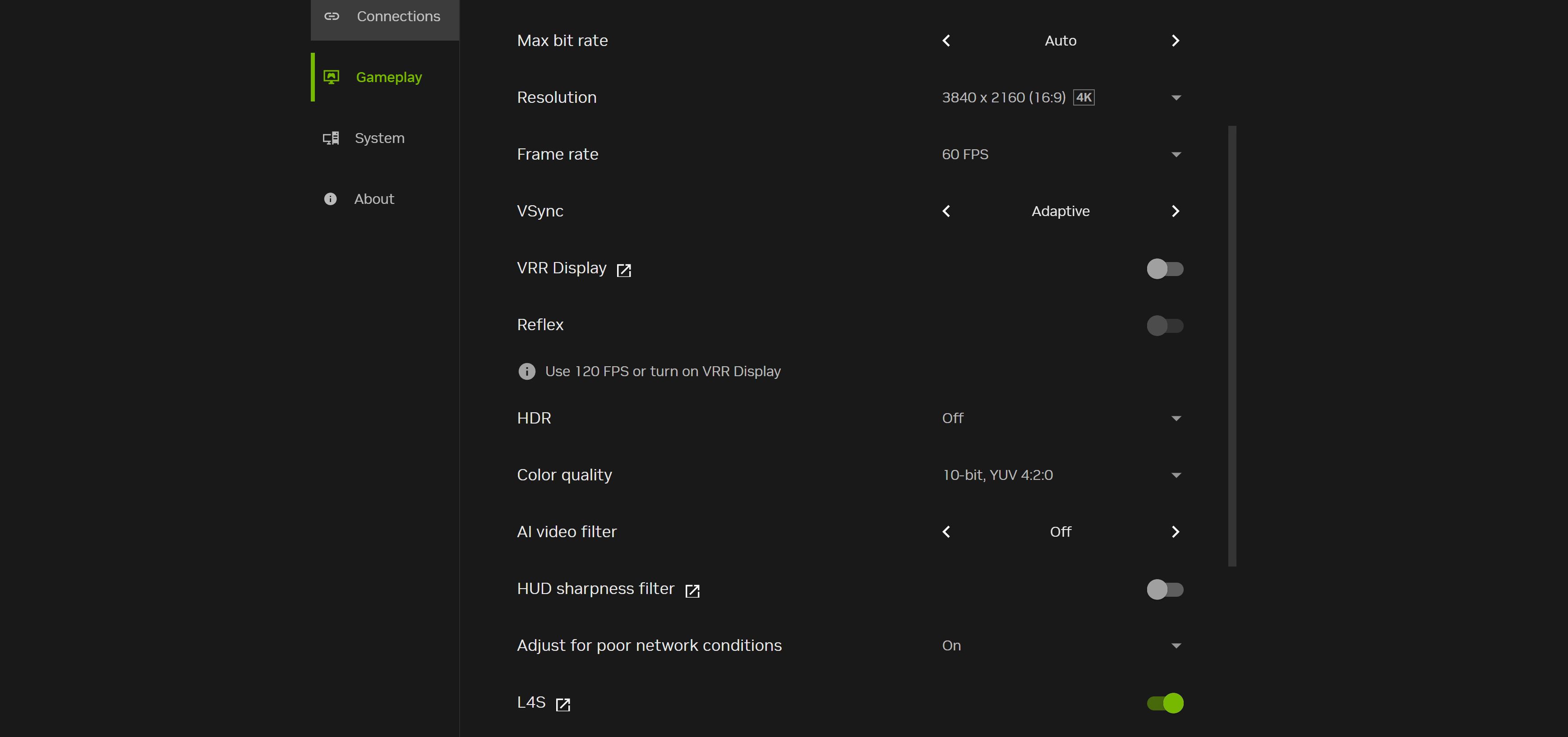 Zároveň, aj keď je v základe Cinematic nastavený na 60 fps, nie je to fixné a môžete si to v custom nastaveniach prestaviť na 120 fps. Len rátajte s tým, že tam bude vyššia záťaž na pripojenie. Nvidia aplikácia vám každé nastavenie aj ukáže vhodný bitrate a pri 4K 120fps je to 58 Mbps, pri 60fps je to 50 Mbps, pričom za hodinu miniete 17 GB, respektíve 15 GB dát.