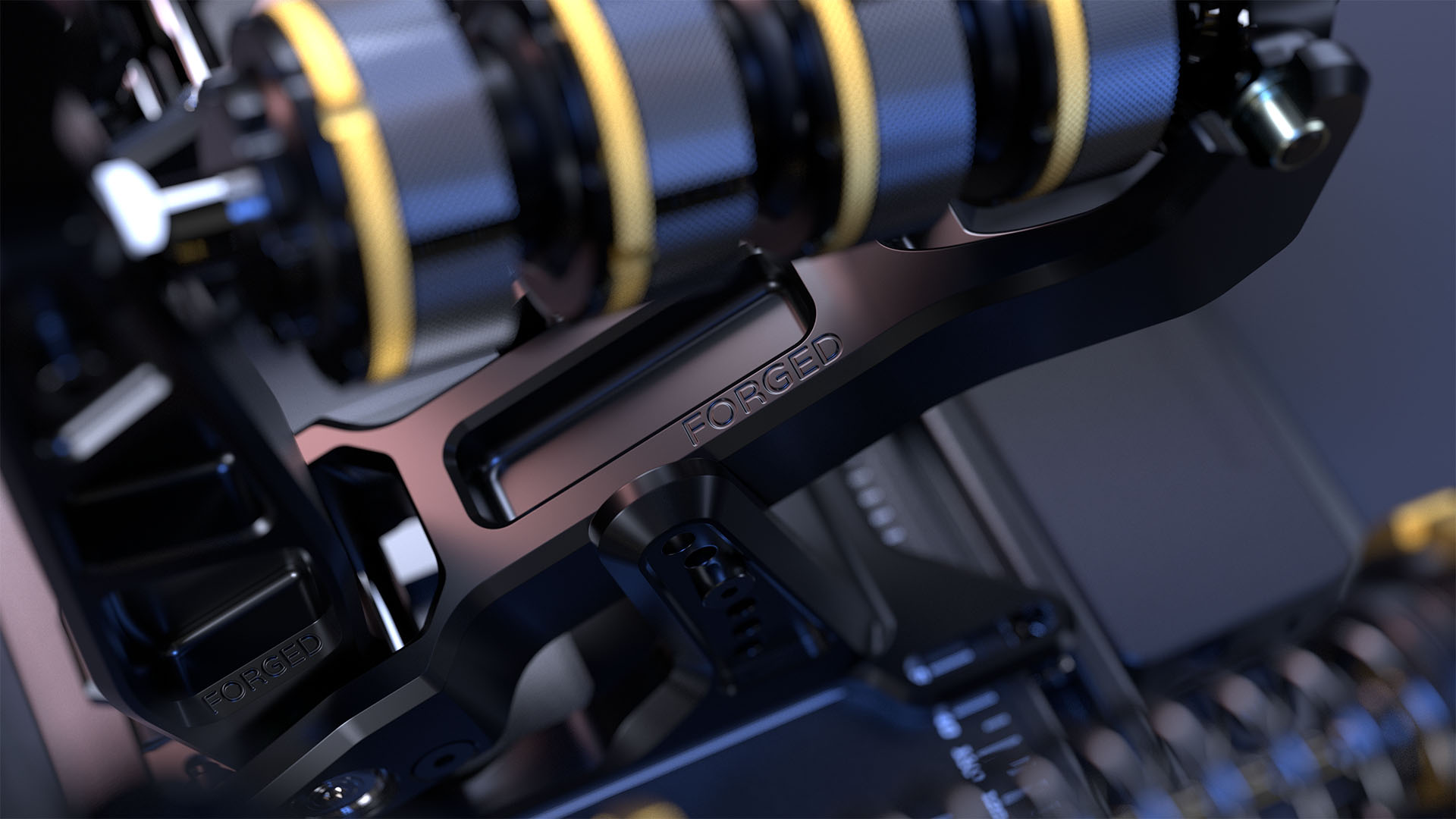 Úplne nová sada pedálov Podium Pedals bola navrhnutá od základu v Nemecku. Využíva CNC opracovaný a liaty hliník, priemyselné ložiská a senzory kalibrované priamo vo výrobe. Dostupná bude vo dvoch verziách - 3-pedálová sada a Formula 2-pedálová sada.