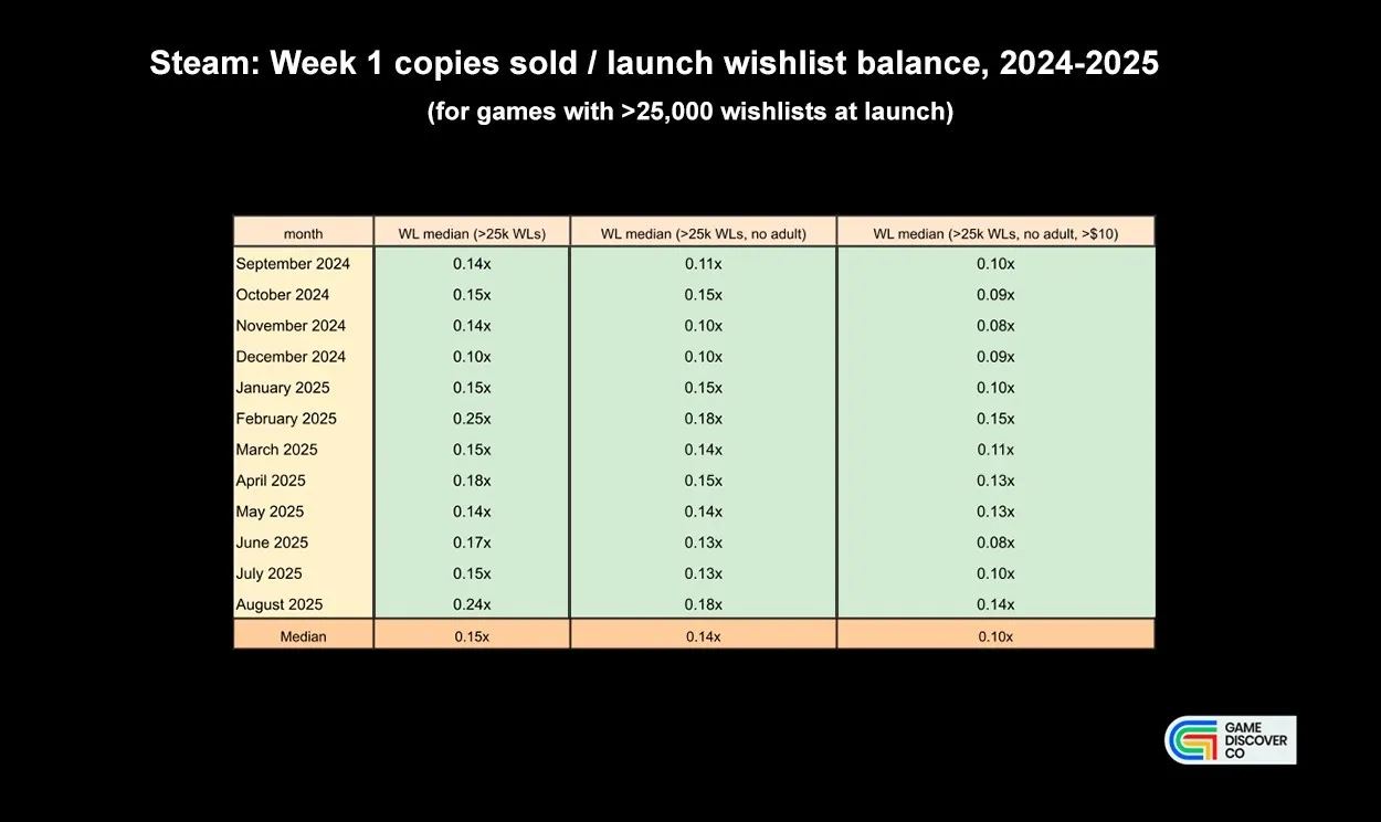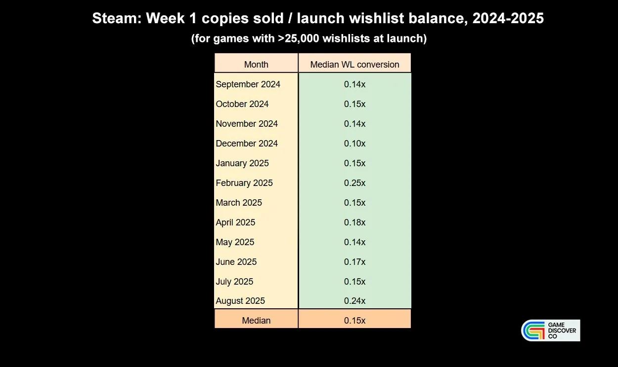 GameDiscoverCo, výskumná agentúra zameraná na „discoverability“ hier, zverejnila rozsiahlu analýzu dát o tom, ako sa Steam Wishlists premieňajú na reálne predaje počas prvého týždňa po vydaní. Údaje zahŕňajú všetky hry s viac ako 25 000 želaniami (wishlists) vydané medzi septembrom 2024 a septembrom 2025.