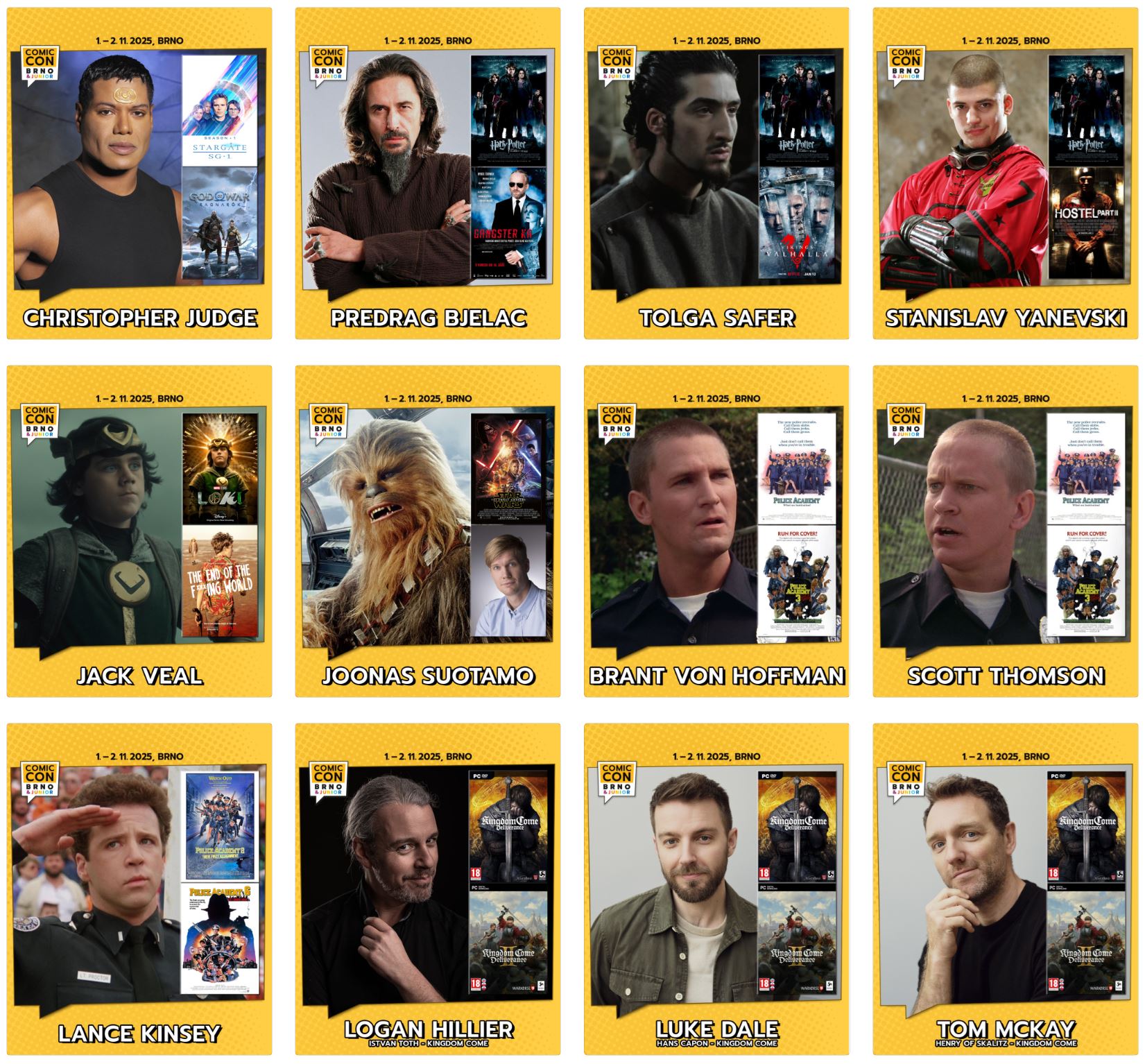 Ku delegácii zo sveta Hviezdnej Brány sa však ku Christopherovi pridá aj Tony Amendola, ktorý sa nepreslávil iba ako majster Bra’tac, ale zahral si aj ďalšieho majstra a to v hre zo sveta Star Wars, konkrétne v titule Jedi Fallen Order. Trio hviezdnych cestovateľov uzavrie ešte falošný boh Apophis - Peter Williams. A keď sme už pri tých prisľúbených bohoch, ďalšieho z nich, no značne mladšieho si zahral v seriáli Loki Jack Veal. Na sci-fi vlnách nás udrží ešte aj Joonas Suotamo, známy ako novodobý Chewbacca, no objavil sa aj vo Wednesday. 20 rokov od premiéry filmu Harry Potter a Ohnivý pohár pripomenú zástupcovia z Durmstrangu - Predrag Bjelac (Igor Karkarov), Stanislav Yanevski (Viktor Krum) a Tolga Safer (pobočník Karkarova). Po dvoch desaťročiach sa do Brna zídu aj štyria predstavitelia kultovej Policajnej akadémie - Lance Kinsey, Brian Tochi, Scott Thomson a Brant von Hoffman. Nebudú však chýbať ani domáci českí herci ako Pavel Nový či Lukáš Vaculík.
