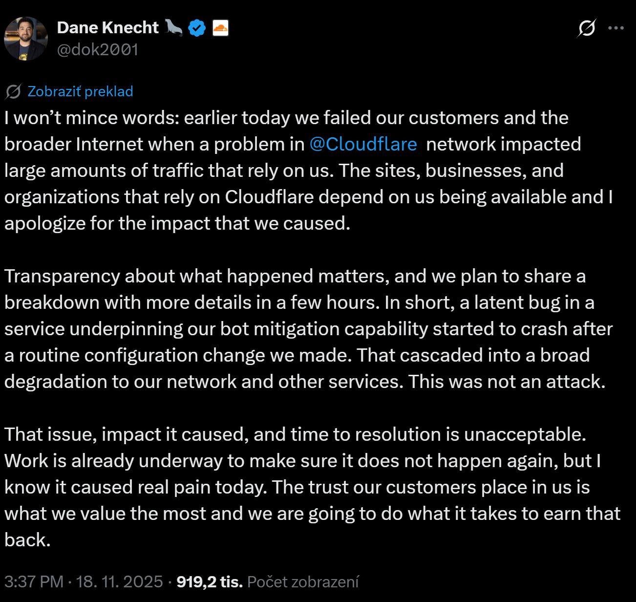 Cloudflare v dnes zasiahla rozsiahla porucha, ktorá odstavila veľkú časť internetu a ovplyvnila aj prístup k službám ako X, ChatGPT či Downdetector. Firma potvrdila, že problém nespôsoboval útok, ale chyba v jej vlastnom systéme na mitigáciu botov, ktorú vyvolala bežná konfiguračná zmena. Latentný bug spustil postupný pád komponentov a následnú degradáciu siete. Výpadok začal okolo 12:48 a dotkol sa aj Cloudflare Access a WARP.