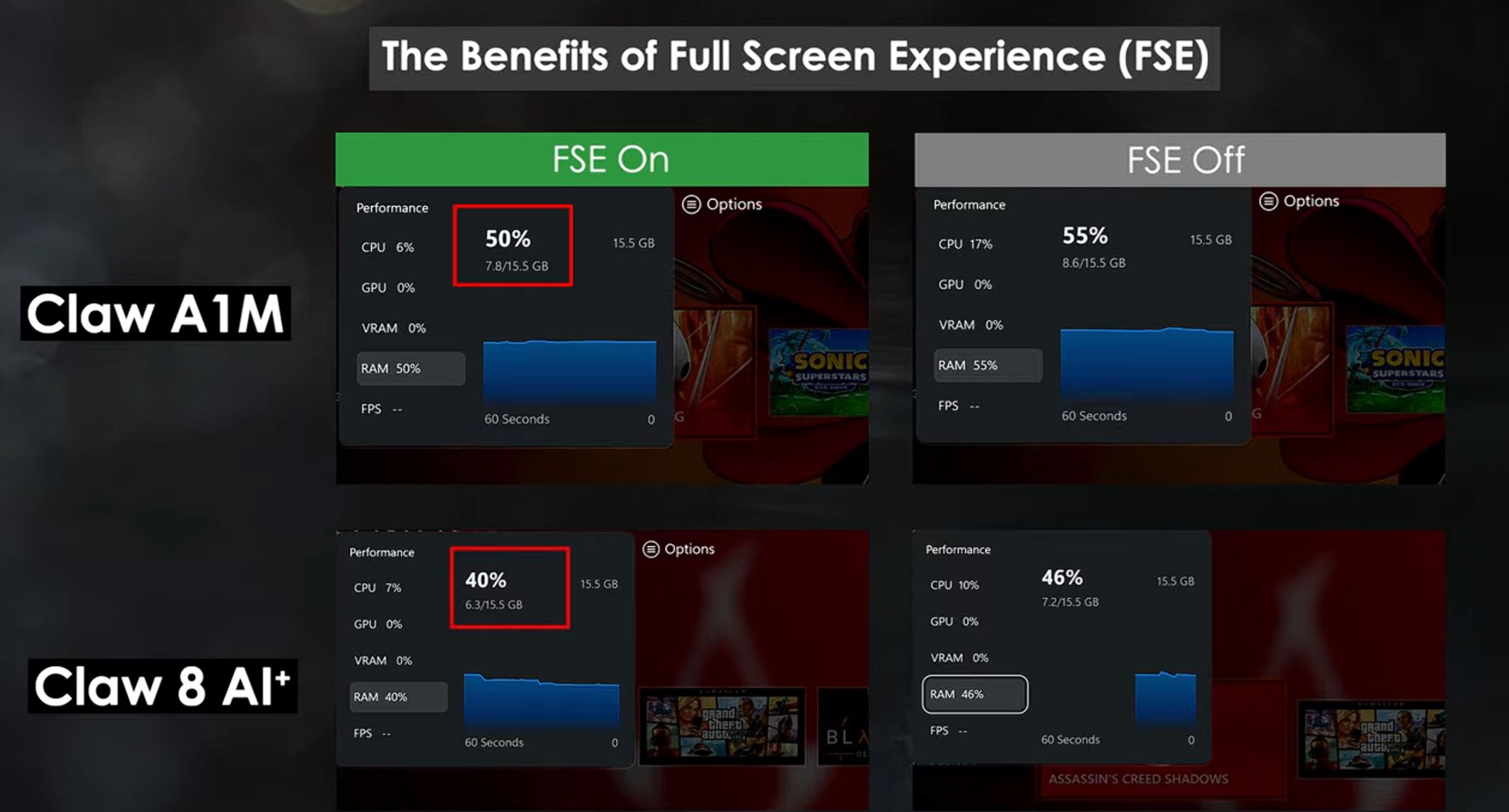 Máme tu ukážku z MSI Claw handheldu s novým updatom, a konkrétne porovnanie pamäte s klasickým Windowsom a s Xbox Full Screen Experience. Teda s Xbox menu, ktoré sa otvorí, po spustení pričom windows sa vtedy nespustí celý.
