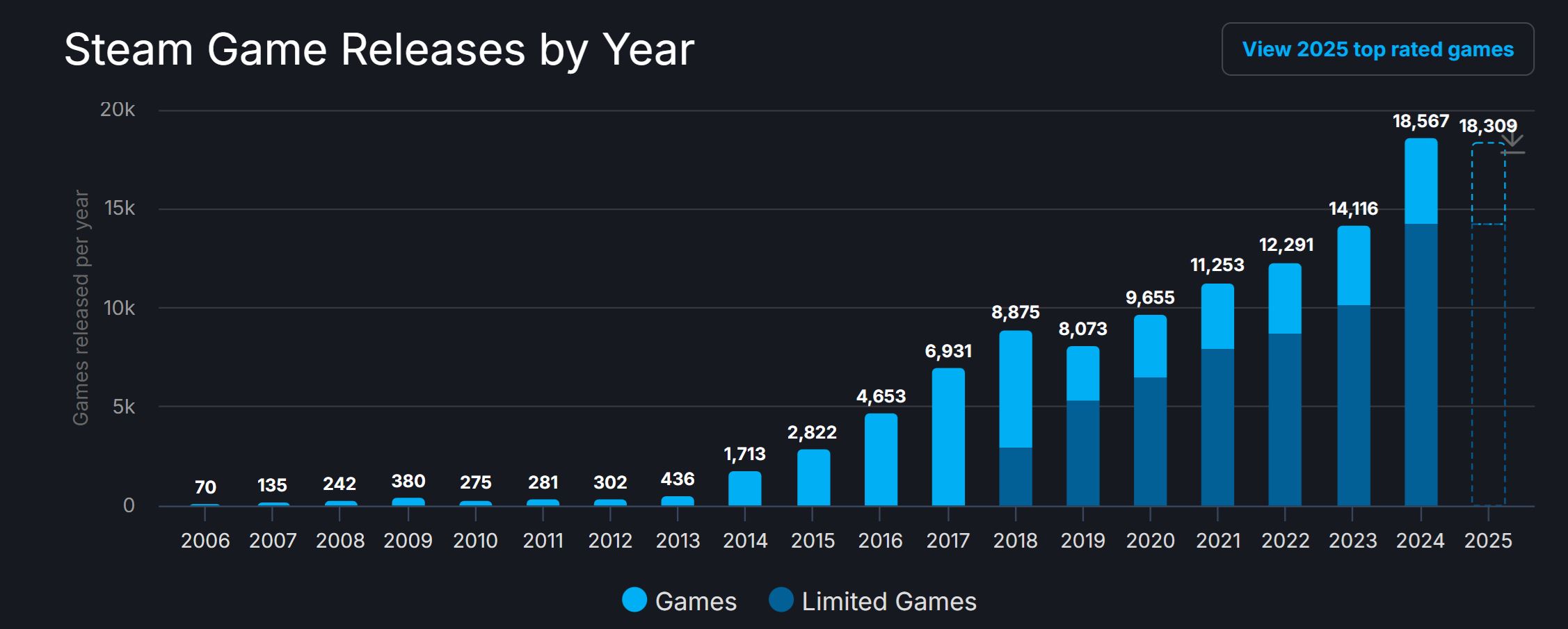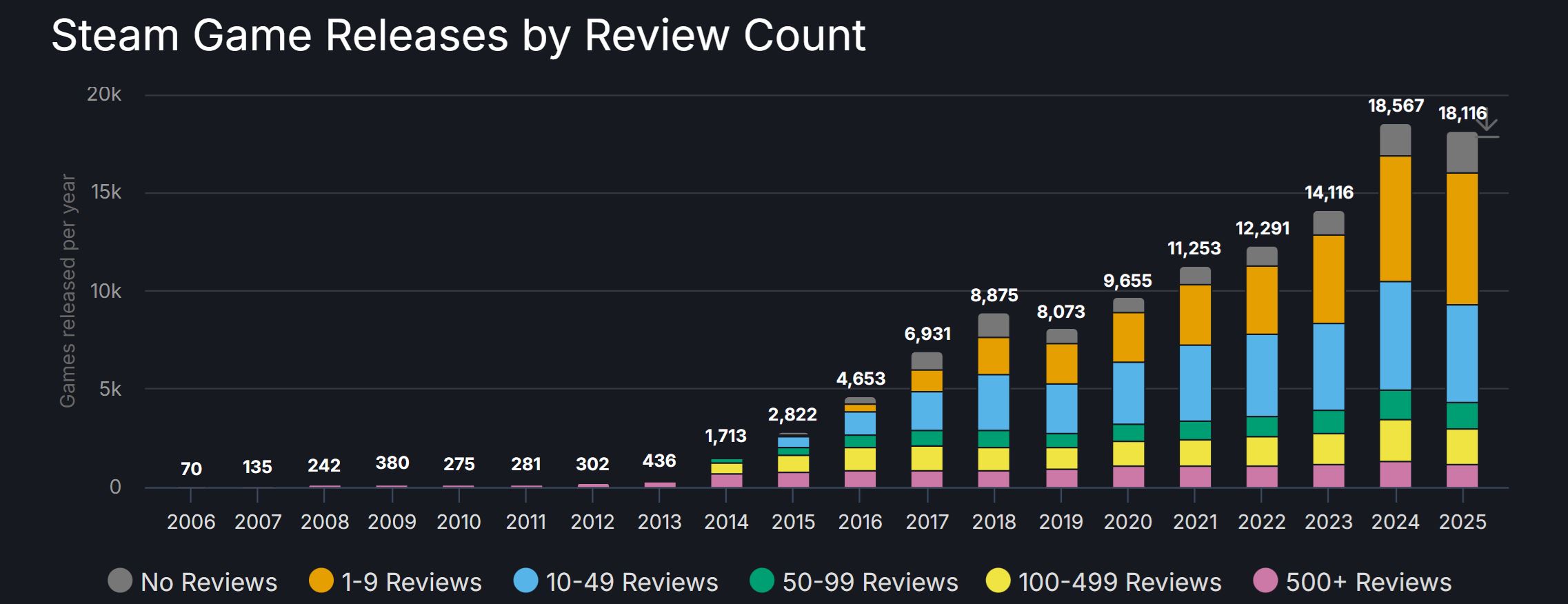 Valve síce dlhodobo zjednodušuje proces vydávania hier na Steame, no výsledkom je aj obrovské množstvo titulov, ktoré sa na platformu dostávajú každý rok. Podľa štatistík SteamDB sa od 1. januára 2025 na Steame objavilo viac ako 18 000 noviniek.