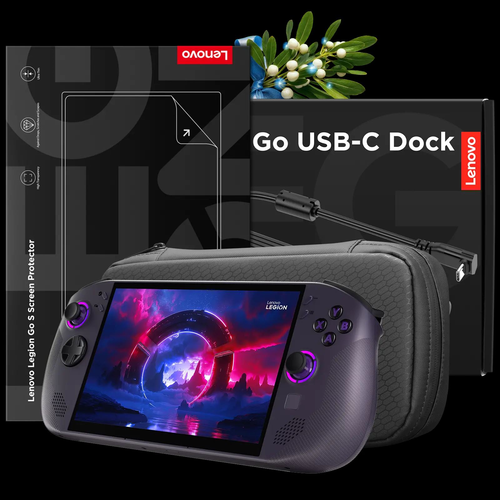 - Lenovo Legion Go S Steam- kompaktná herná konzola s dokovacou stanicou a príslušenstvom.