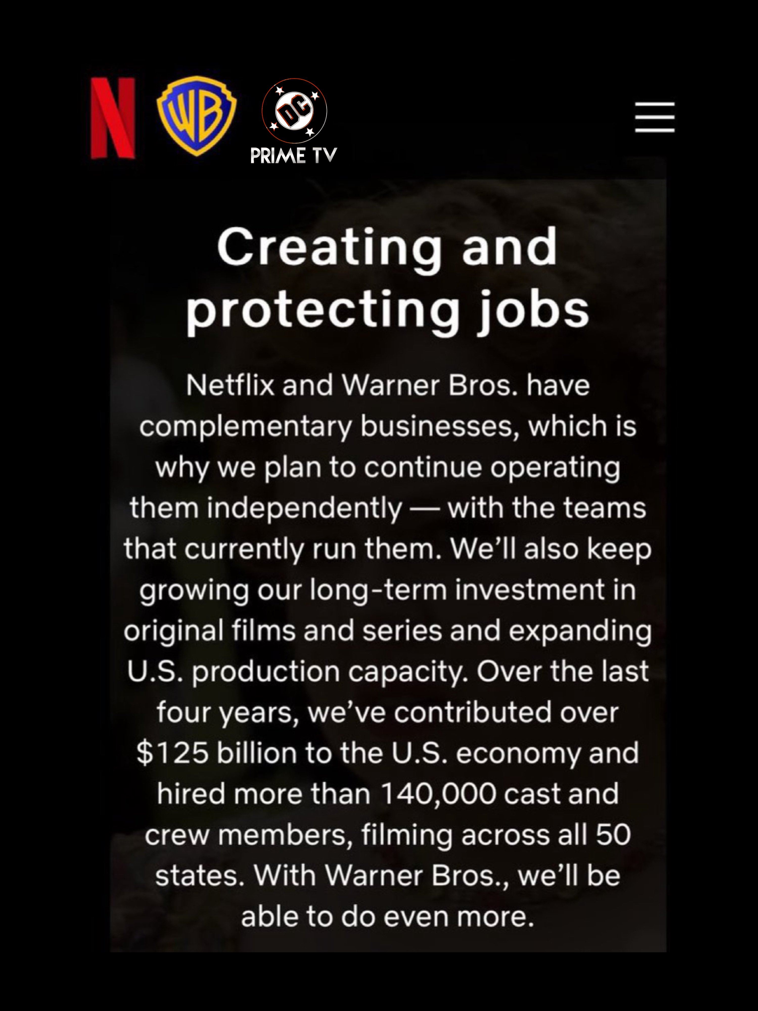 Netflix zároveň tvrdí, že v prípade dohody plánuje ďalej zvyšovať investície do originálnych filmov a seriálov a rozširovať produkčné kapacity v USA. Spojenie s Warner Bros. má podľa firmy umožniť ešte väčší rozsah týchto aktivít.