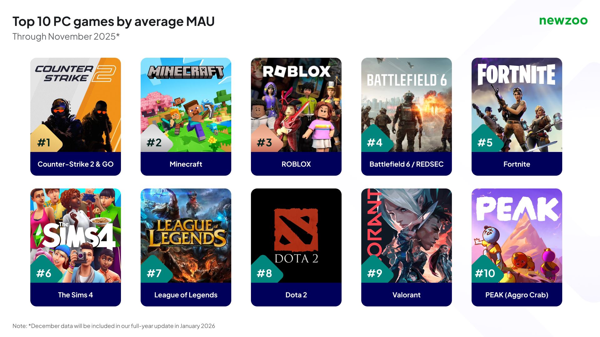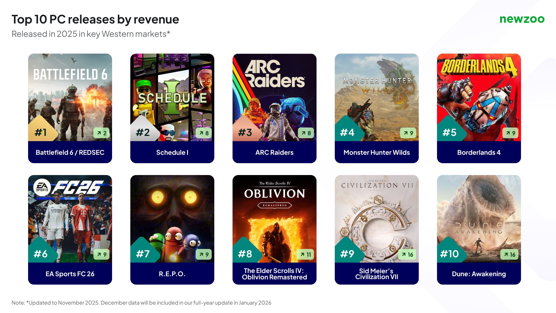 Na PC boli medzi desiatimi najvýnosnejšími hrami výhradne prémiové tituly vydané v roku 2025. Zaujímavé je, že viaceré z nich neboli postavené na existujúcich značkách. Hry ako ARC Raiders, Schedule I, R.E.P.O. či Dune: Awakening potvrdili, že PC zostáva otvorenou platformou pre nové značky aj menšie AA projekty. Zároveň sa ukázala výrazná žánrová rozmanitosť, keď top hry pokrývali šesť rôznych žánrov, hoci najväčší podiel si naďalej držali strieľačky.
