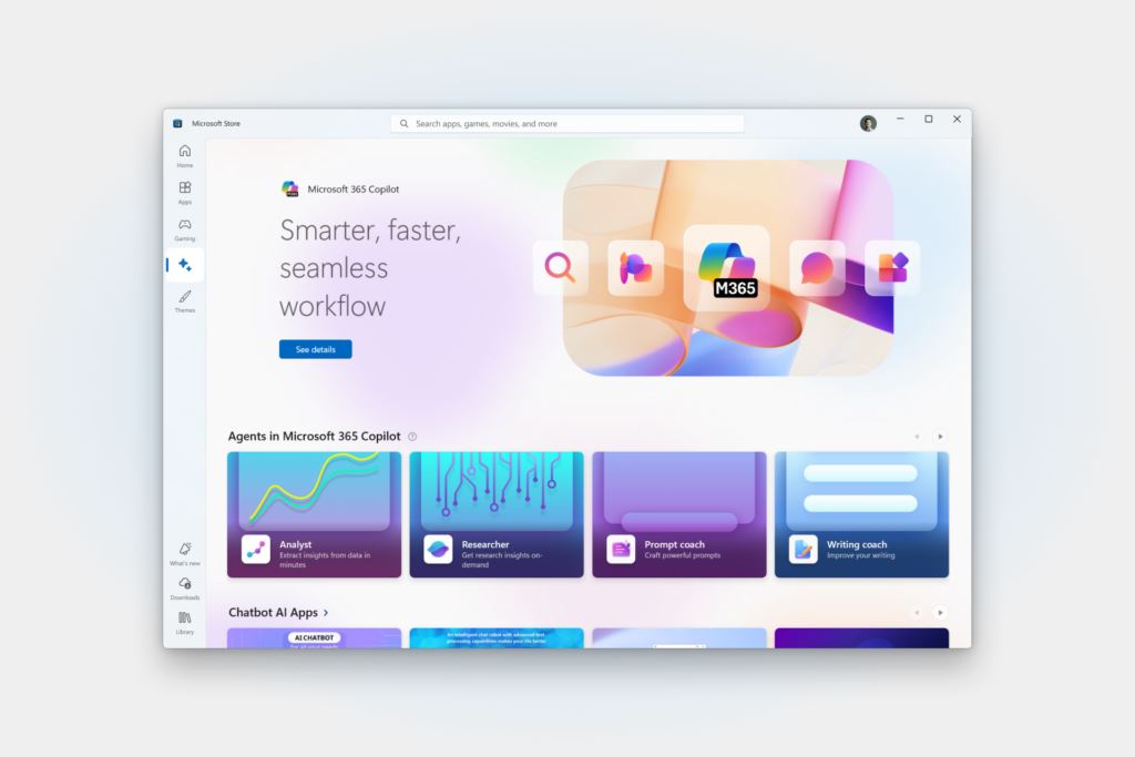 Obchod reaguje aj na rastúci počet aplikácií využívajúcich umelú inteligenciu. AI Hub bol prepracovaný tak, aby bolo jednoduchšie pochopiť, čo konkrétne AI aplikácie ponúkajú. Na stránkach aplikácií pribudli označenia, ktoré upozorňujú na podporu AI funkcií alebo optimalizáciu pre Copilot+ PC.
