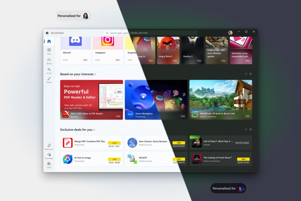 Microsoft Store získal samostatnú sekciu pre témy systému Windows. Používatelia si tak môžu jednoduchšie vyhľadávať a inštalovať vizuálne motívy podľa štýlu alebo záujmov. Zároveň sa rozšírila personalizácia samotného obchodu - odporúčania už nie sú len na domovskej stránke, ale aj na stránkach aplikácií a hier, pričom sa prispôsobujú regiónu a správaniu používateľa. Tieto odporúčania sú ovládateľné v nastaveniach Store.