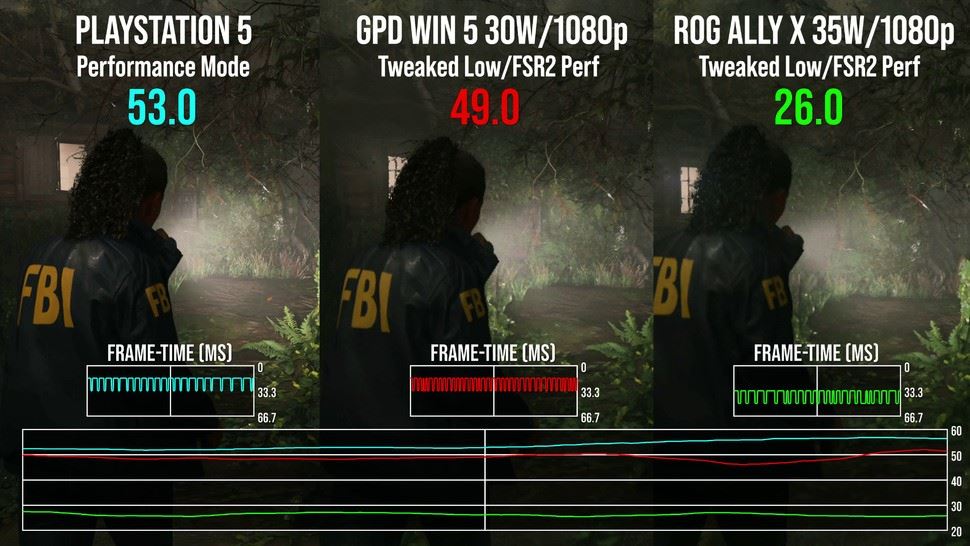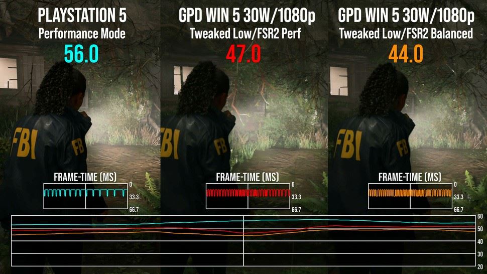 - No dôležité je, že pri znížení spotreby na 30 W a nastavení 1080p rozlíšenia sa výkon pohyboval medzi 85 až 93 % PS5 v závislosti od režimu FSR 2, čo je veľmi nezvyčajný výsledok.
