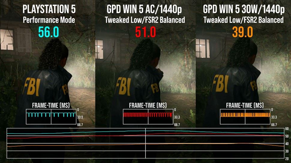- Pri rovnakých nastaveniach ako na PlayStation 5 dosahoval GPD Win 5 pri napájaní zo siete a spotrebe okolo 70 W približne 93 % výkonu PS5 v režime výkonu.