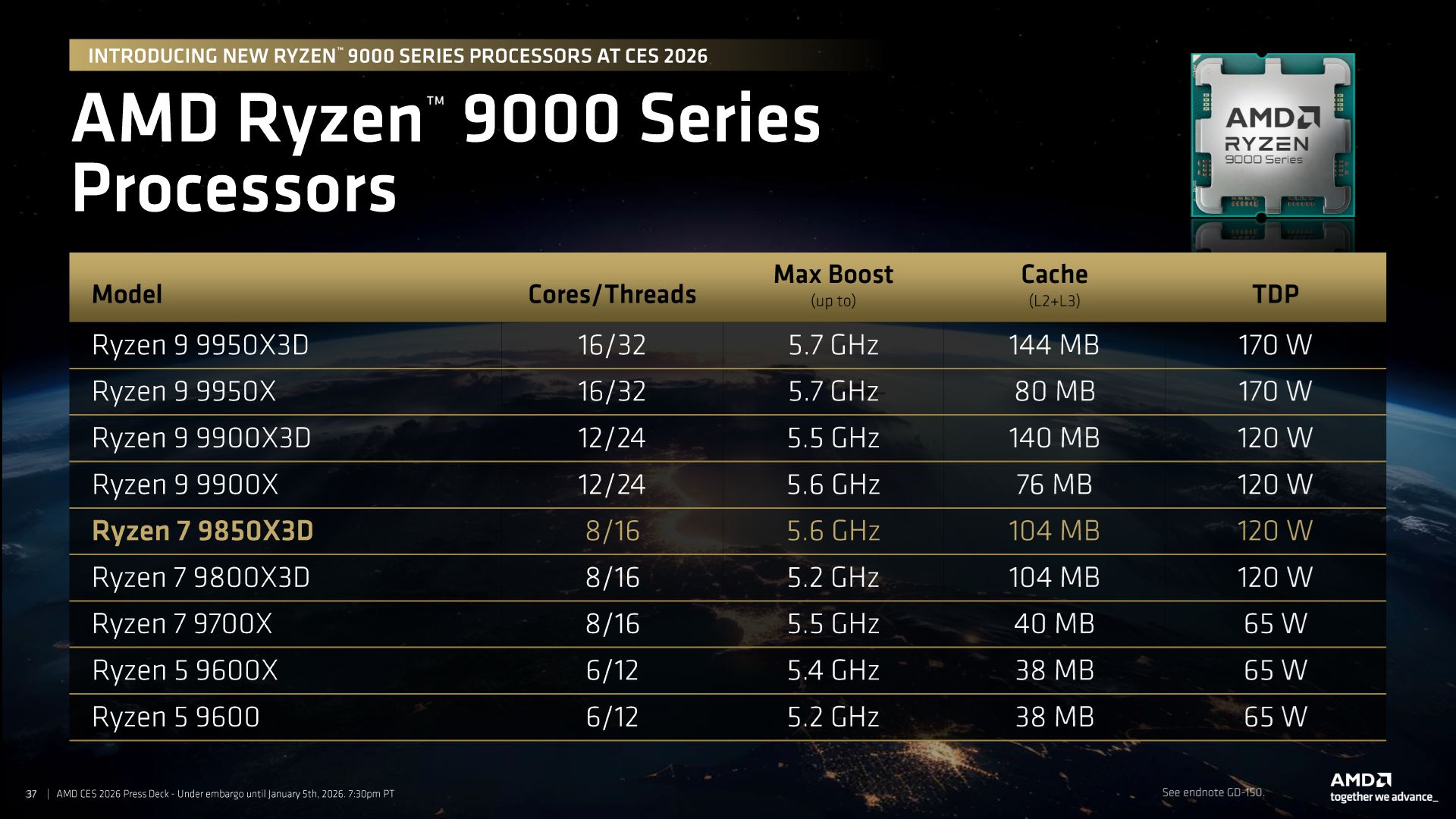 Na CES 2026 showcase, teda oficiálnej produktovej prezentácii, AMD detailne predstavilo nový procesor AMD Ryzen 7 9850X3D, ktorý rozširuje aktuálnu ponuku čipov so 2. generáciou 3D V-Cache. Novinka je postavená na architektúre Zen 5 a cieli predovšetkým na herné zostavy, kde má podľa údajov z prezentácie priniesť ďalšie zlepšenie výkonu oproti predchádzajúcemu modelu 9800X3D.