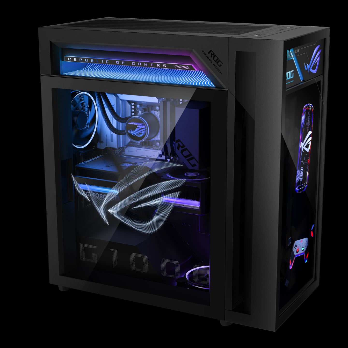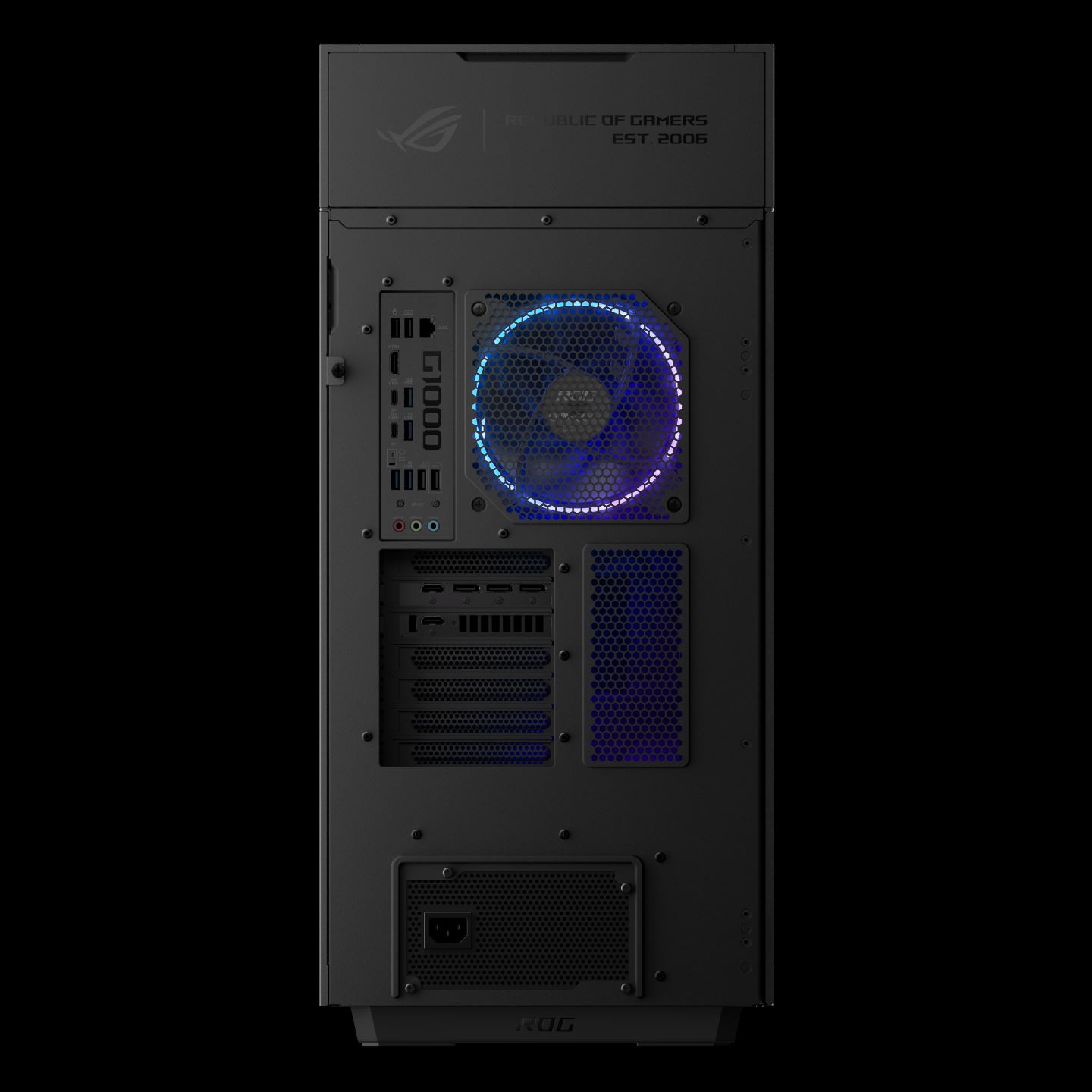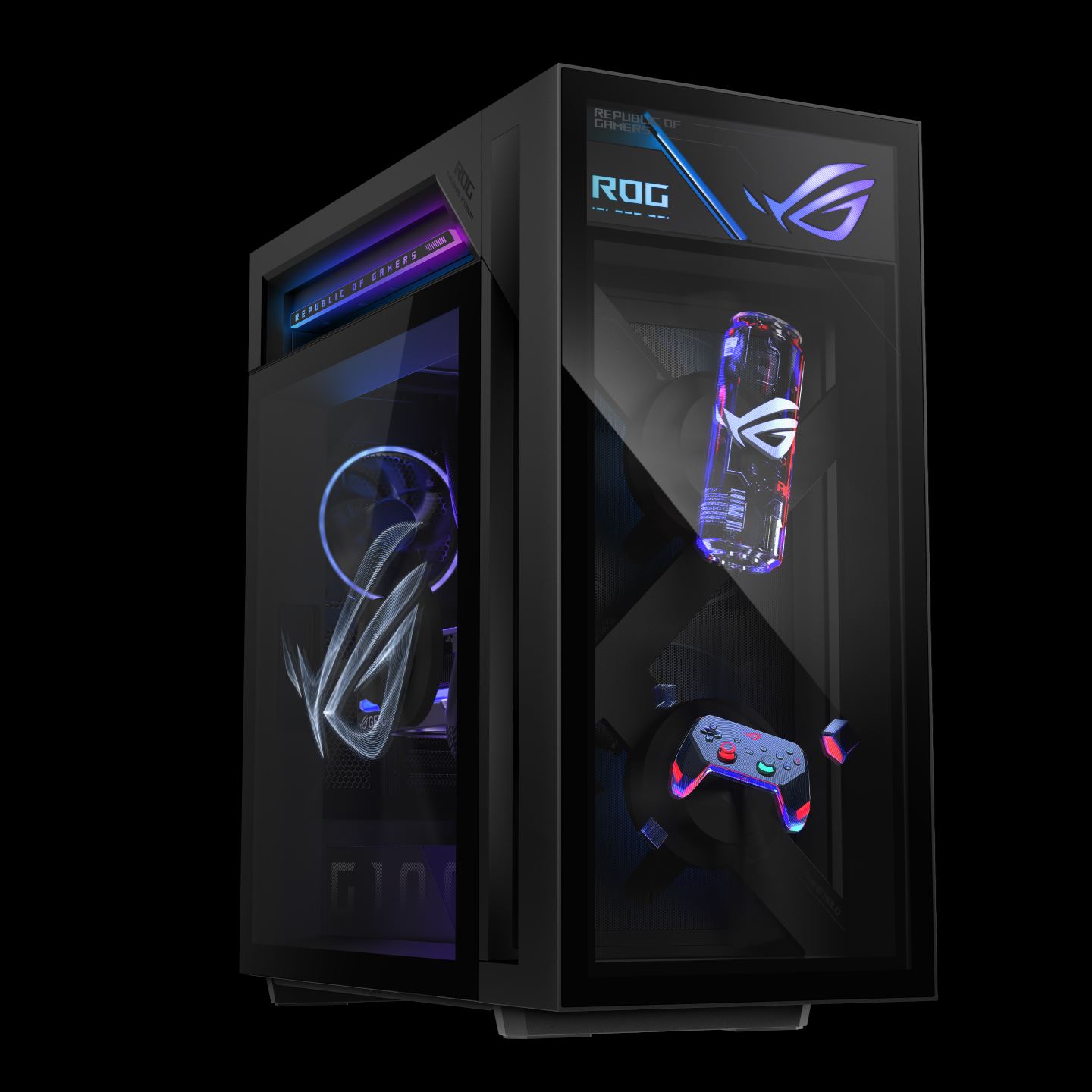 ROG G1000 je postavený na masívnej E-ATX skrini s dôrazom na prúdenie vzduchu a oddelené zóny chladenia. V maximálnej konfigurácii ponúka AMD Ryzen 9 9950X3D, alternatívne aj Ryzen 7 9850X3D, grafiku až GeForce RTX 5090 v edícii ROG Astral, základnú dosku série X870, až 128 GB DDR5 pamäte a PCIe 5.0 SSD s kapacitou do 4 TB. O napájanie sa stará 1000 W zdroj s certifikáciou 80+ Gold.