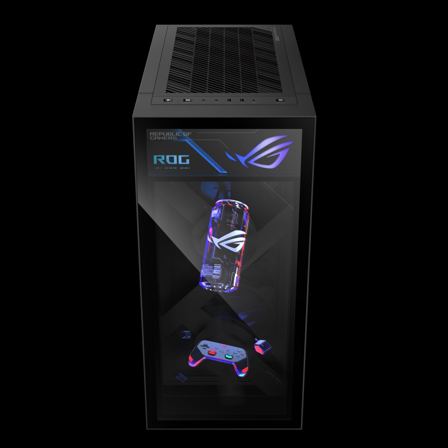 Okrem holografických prvkov má zostava aj klasické chladenie zamerané na grafiku a základnú dosku. Predná časť obsahuje dva veľké nasávacie ventilátory, spodok skrine dopĺňa 140 mm intake a zadná časť 140 mm exhaust ventilátor. ASUS uvádza viac než 40 % nárast prietoku vzduchu a citeľné zníženie teploty nasávaného vzduchu pre GPU.