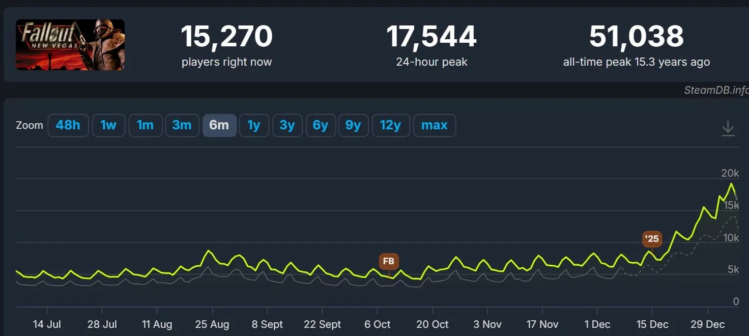 Pozitívny efekt pocítil aj Fallout 76, ktorý sa dlhodobo drží na stabilnej úrovni, no po návrate seriálu zaznamenal citeľný skok v aktivite. Hoci k decembrovým číslam mohli prispieť aj zľavy v rámci Steam Winter Sale, porovnanie s inými veľkými RPG titulmi ukazuje, že samotné výpredaje tento efekt plne nevysvetľujú.