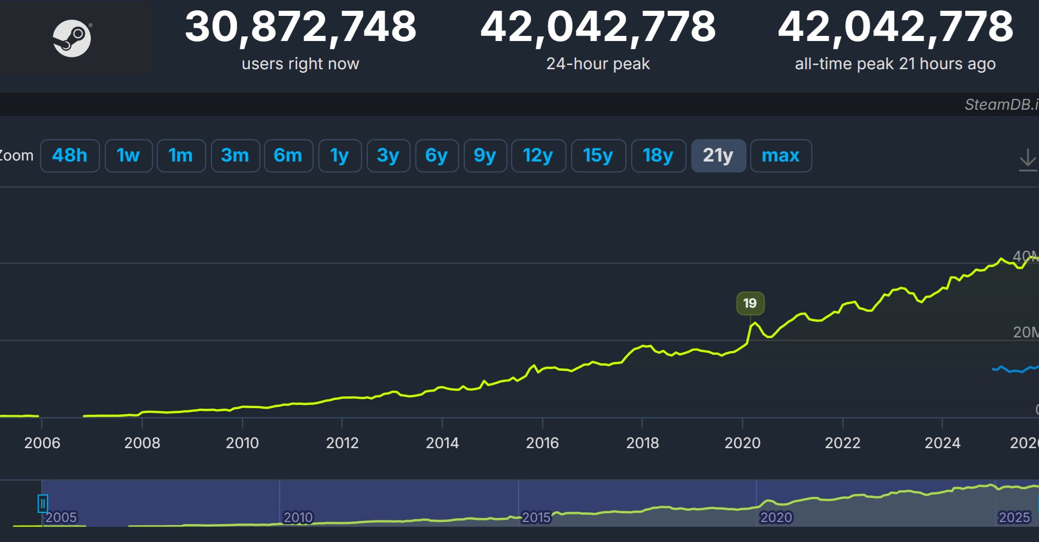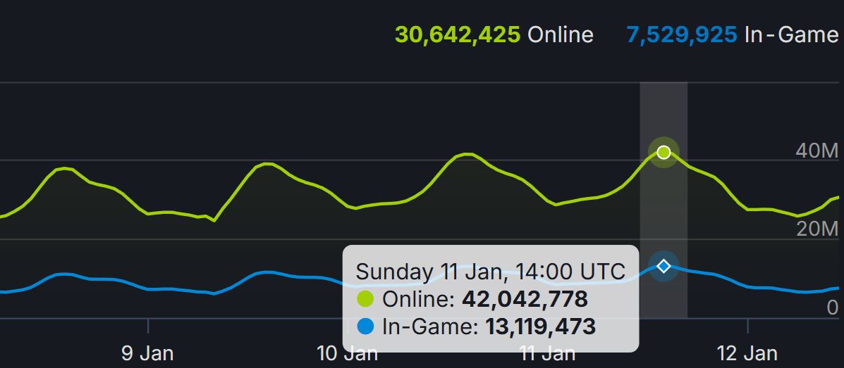 Steam znovu zvýšil svoje čísla a prekonal 42 miliónov súčasne prihlásených používateľov. Sú to len prihlásení a teda že majú aj v pozadí desktopu pustený. Priamo v hre bolo 13 miliónov používateľov.