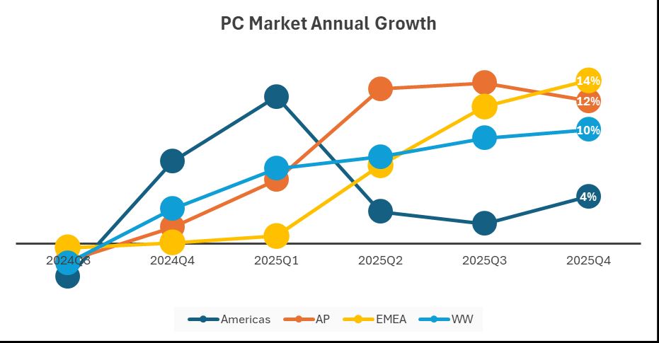 Globálny PC trh zaznamenal v 4. štvrťroku 2025 rast o 9,6 %, pričom za celý rok 2025 si polepšil o 8,1 % oproti roku 2024. Vyplýva to z najnovších dát organizácie IDC. Na prvý pohľad ide o pozitívne čísla, no podľa analytikov ide skôr o dočasný výkyv, spôsobený urýchlenými nákupmi a tvorbou zásob pred očakávanou pamäťovou krízou.