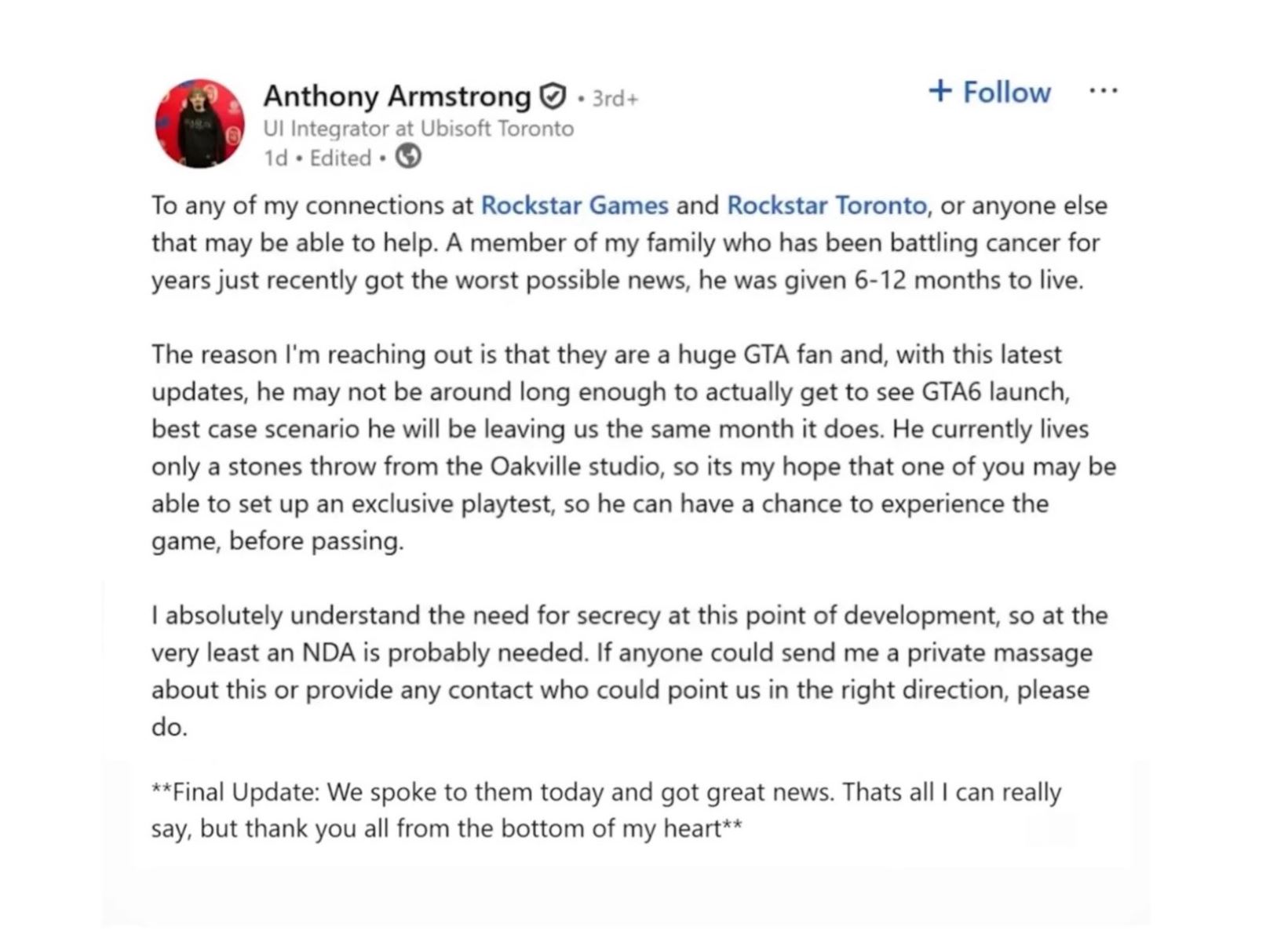 Vývojár Anthony Armstrong z Ubisoft Toronto zverejnil na LinkedIne výnimočný príspevok, v ktorom verejne oslovil Rockstar Games. Žiadal o pomoc pre smrteľne chorého člena rodiny, ktorý je veľkým fanúšikom série GTA a podľa lekárov mu zostáva šesť až dvanásť mesiacov života. Armstrong upozornil, že s aktuálnymi plánmi vydania hry Grand Theft Auto VI je možné, že sa jej oficiálneho vydania už nedožije.