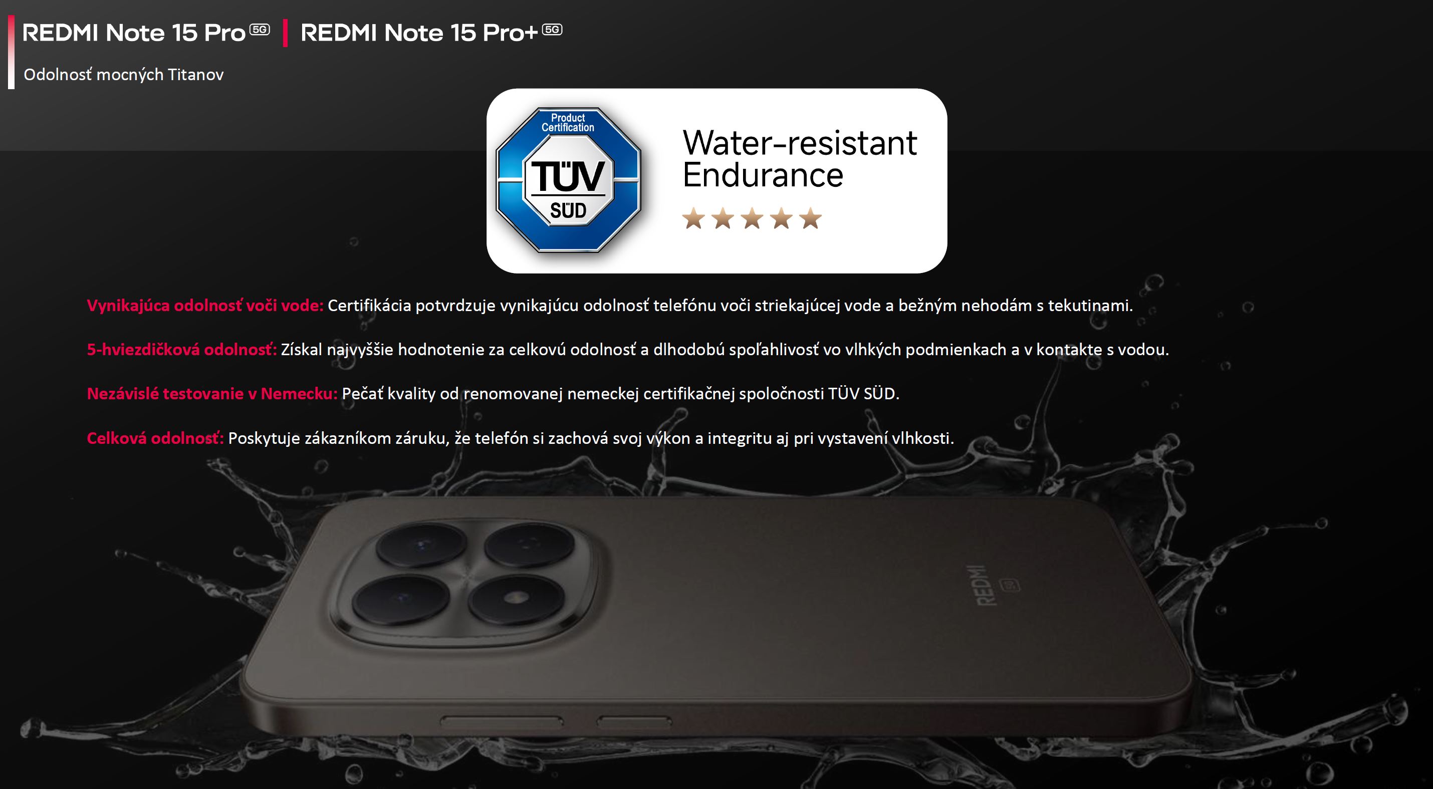 Redmi Note 15 séria stavia odolnosť ako štandard, nie ako doplnkovú vlastnosť. Konštrukcia zariadení je navrhnutá tak, aby zvládala každodenné situácie - od pádov a nárazov až po kontakt s vodou či prachom.