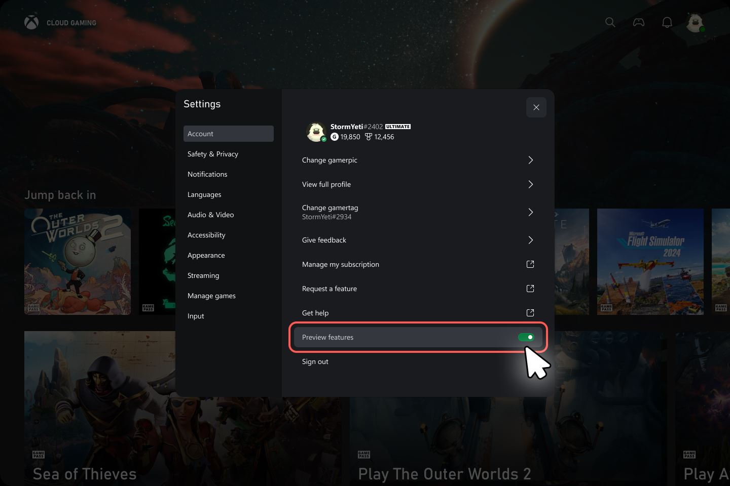 Do testovania sa dá zapojiť cez stránku Xbox Cloud Gaming po prihlásení sa k Xbox účtu. V nastaveniach je potrebné zapnúť možnosť Preview Features - Ukážky, po ktorej aktivácii sa nový zážitok sprístupní buď cez odkazy priamo na stránke, alebo zadaním adresy play.xbox.com. Zmena sa nemusí prejaviť okamžite a môže trvať až niekoľko minút, pričom používateľ sa môže kedykoľvek vrátiť späť k pôvodnému rozhraniu.
