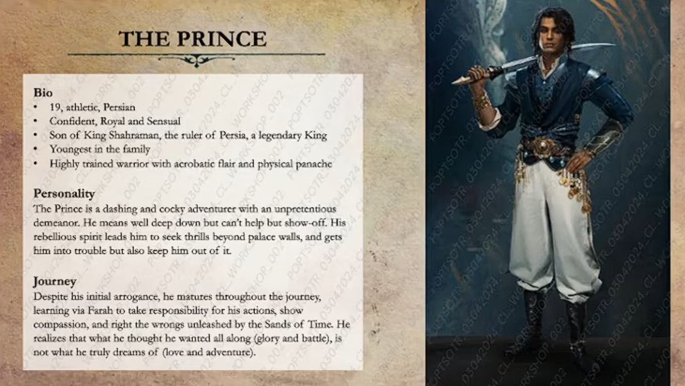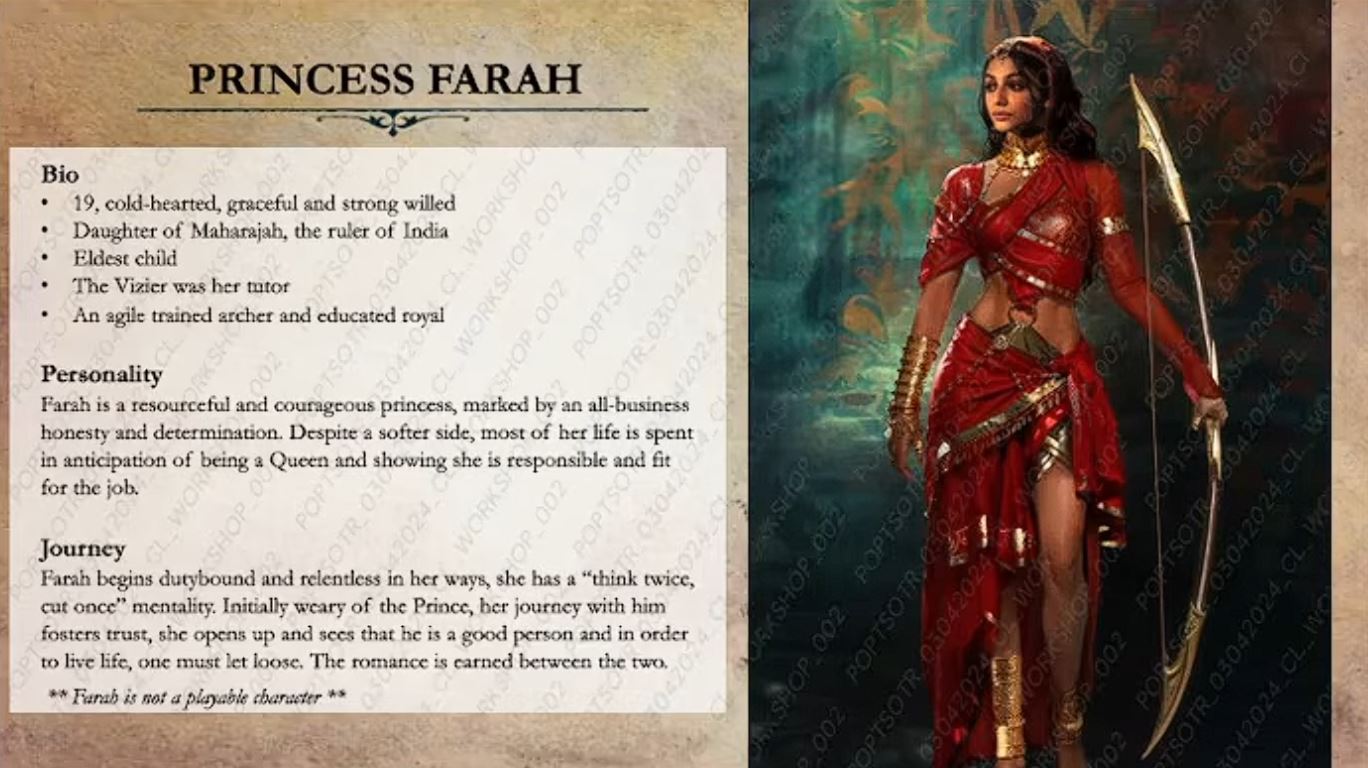 Pri postavách tím hovorí, že princa aj Farah posunuli vekom na 19 rokov. Princ má zostať sebavedomý a trochu frajerský dobrodruh, no s príbehom dospievania, v ktorom sa z arogancie učí zodpovednosti. Farah má byť tvrdšia, pragmatickejšia a „all business“, s vlastným oblúkom, v ktorom sa cez kontakt s princom viac otvorí. Novinkou je aj to, že vazír bol Farahiným tutorom, čo má prehĺbiť ich vzťah a priniesť viac kontextu bez toho, aby z vazíra robili komiksového záporáka s častými vstupmi. Ukazujú rozpracovanú ukážku hereckého snímania a hovoria o použití technológie „face morph“ z Anvil enginu, ktorú využívajú aj väčšie projekty.