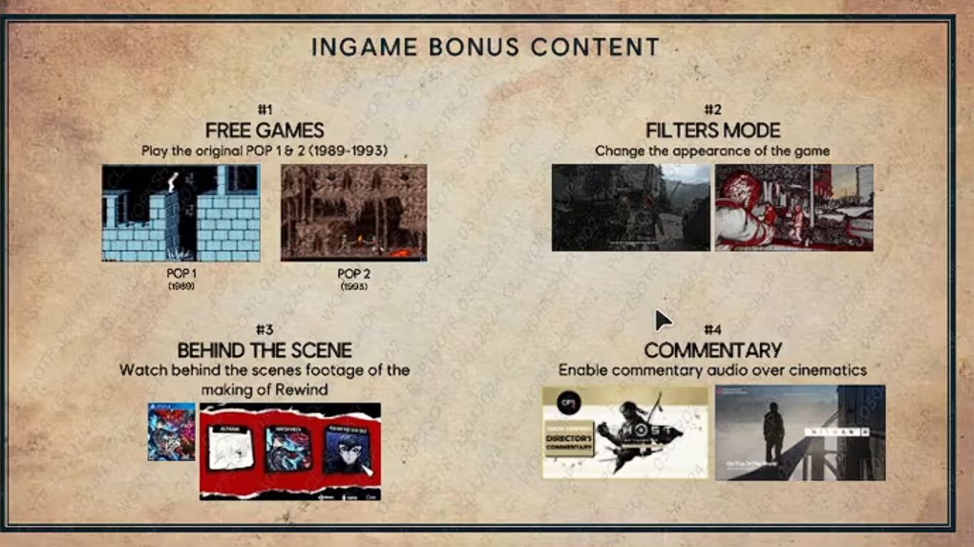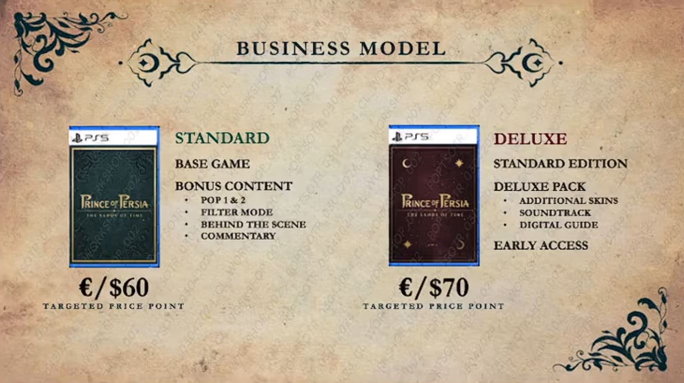 Sebastian potom otvorí marketingovú časť: ukazuje dve smerovania loga (buď nové moderné brandovanie konzistentné s novšími PoP titulmi, alebo modernizovanú verziu loga z roku 2003 s perskou kaligrafiou). Predstaví aj koncept krátkeho teaseru s motívom „rewindu“ cez zhasnutú a znovu sa skladajúcu sviečku a prechod z noci do svitania, s ukrytými detailmi, ako sú astroláb a nákres hradu. Následne riešia edície: štandard a deluxe. Bonusy zvažované do hry zahŕňajú klasické PoP 1 a PoP 2, filtre obrazu, „behind the scenes“ materiály a komentár. Deluxe balík má priniesť skiny, skiny zbraní, digitálny soundtrack a digitálny „adventure guide“. Cenovo spomenú 60 USD za štandard a 70 USD za deluxe, plus skorší prístup pri deluxe (podobne ako The Lost Crown). Pri starých hrách upozorňujú, že je to právne aj technicky komplikované, často kvôli právam a tomu, že sa niekde stratili dáta alebo kód.