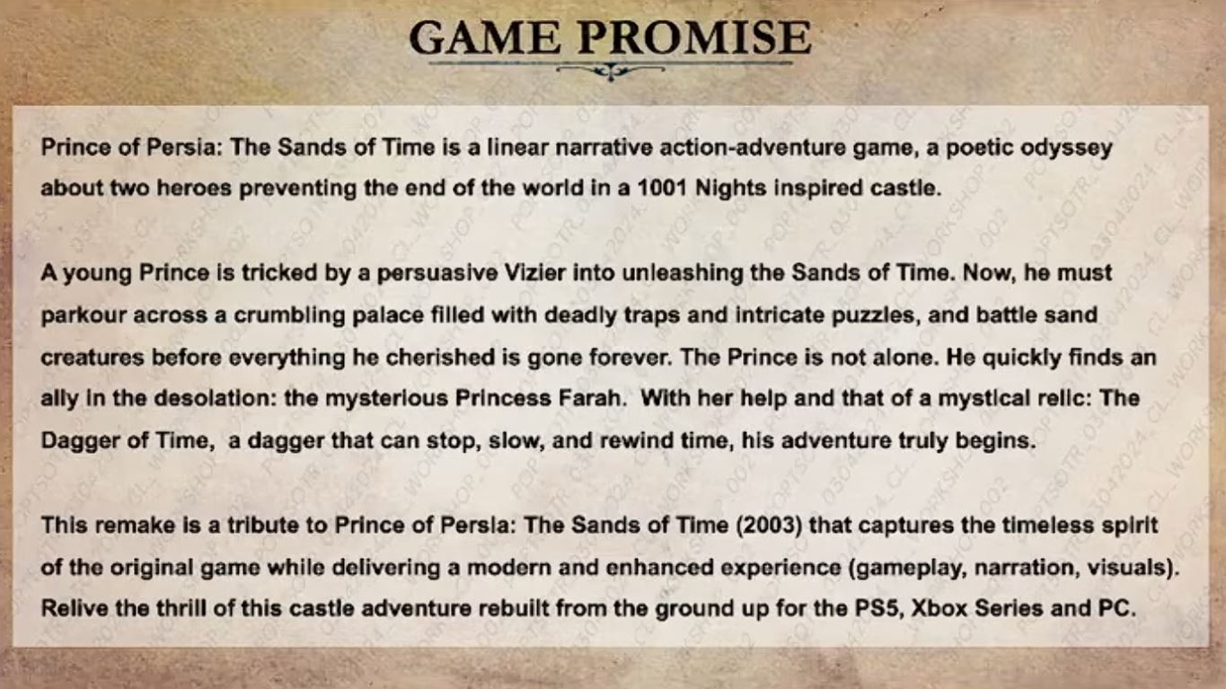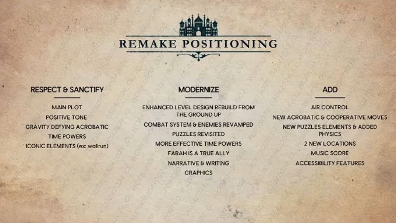 Hovoria, že remake má zostať lineárnym singleplayerovým dobrodružstvom s modernizovaným príbehom, hrateľnosťou a grafikou, pričom tón má ostať „ľahší“ ako v origináli (rating 16+ vraj vychádza najmä z násilia na začiatku). Príbeh sa nemení, udalosti majú ostať rovnaké, no tím chce doplniť viac interakcií princa a Farah, aby vzťah pôsobil prirodzenejšie. Ich „filozofiou remaku“ je byť niekde medzi vernou kópiou a veľkou prestavbou, s prístupom „rešpektovať, zachovať, modernizovať a niečo pridať“.