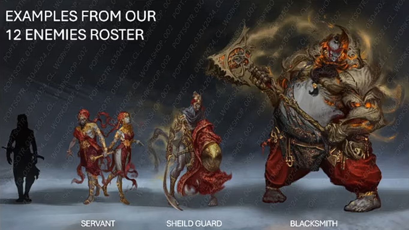Súboje chcú modernizovať, ale zachovať akrobatický „brawler“ feeling. Dôležitou zmenou je, že nepriateľov už nebude nutné vždy „dobíjať“ dýkou cez sand retrieval. Nepriateľov pôjde zabiť bežným damageom, zhodiť z ríms, strčiť do pascí alebo využiť „friendly fire“. Sand retrieval zostáva jediným spôsobom, ako získať piesok späť, takže ide o voľbu riziko-odmena. Pridávajú knockback, knockdown, prone a výraznejšie využitie prostredia. Predstavujú tri rané archetypy nepriateľov: sluhovia (aj ženská varianta), strážcovia so štítom a veľký blacksmith, ktorý má byť vhodný na „friendly fire“ a otvárať okná na nové útoky (napríklad slide útok popod neho). Vizualitu nepriateľov stavajú na „sand corruption“ a luxusnom štýle Azadu, aby bolo jasné, že sú „prázdni“ a už nezachrániteľní inak než veľkým finálnym rewindom.