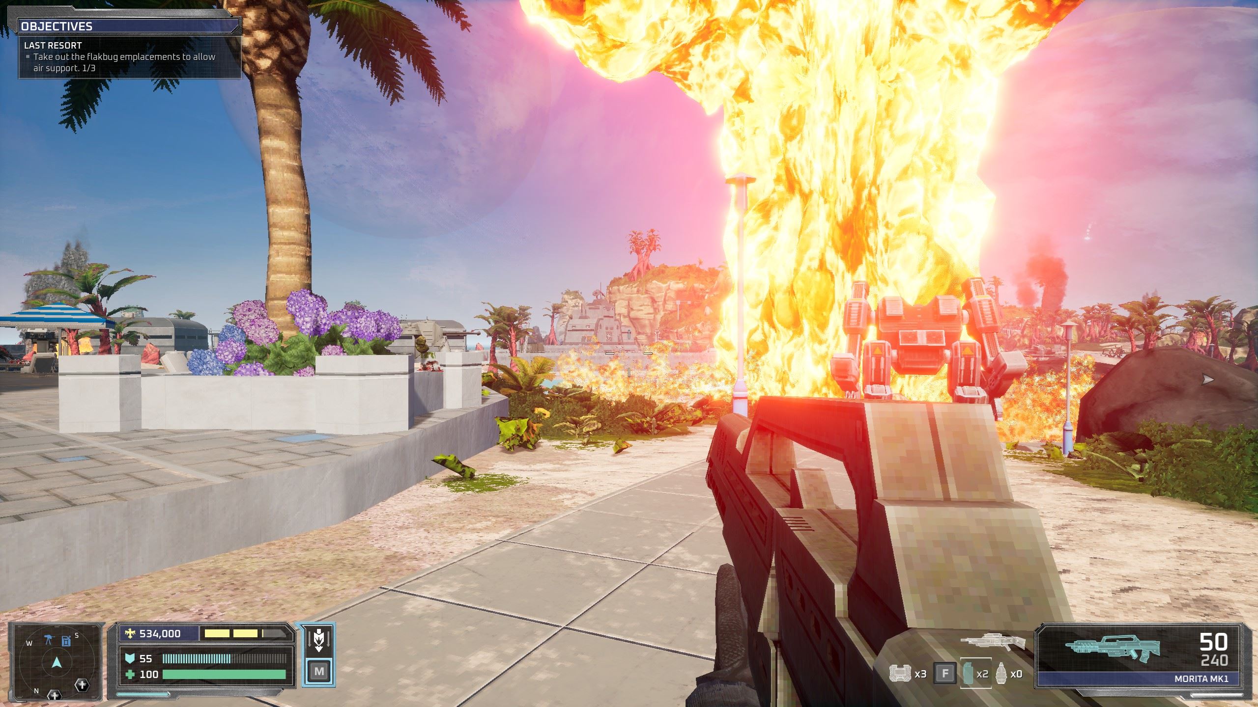 V teréne však neraz môžete využívať stacionárne guľomety alebo aj nasadnúť do bojového mecha, ktorý toho znesie dosť veľa. A keď už dožíva, dá vám vedieť, že o niekoľko sekúnd vybuchne a mali by ste vyliezť z kokpitu. Dostanete sa aj k bojovým doplnkom, ako sú nálože, privolanie artilérie na zvolený cieľ a podobne a efekt je ničivý a parádny. Ak chcete obmedziť nepriateľské posily, môžete likvidovať hniezda, odkiaľ neustále vyliezajú, ale aj tak budú prichádzať aj z iných miest.