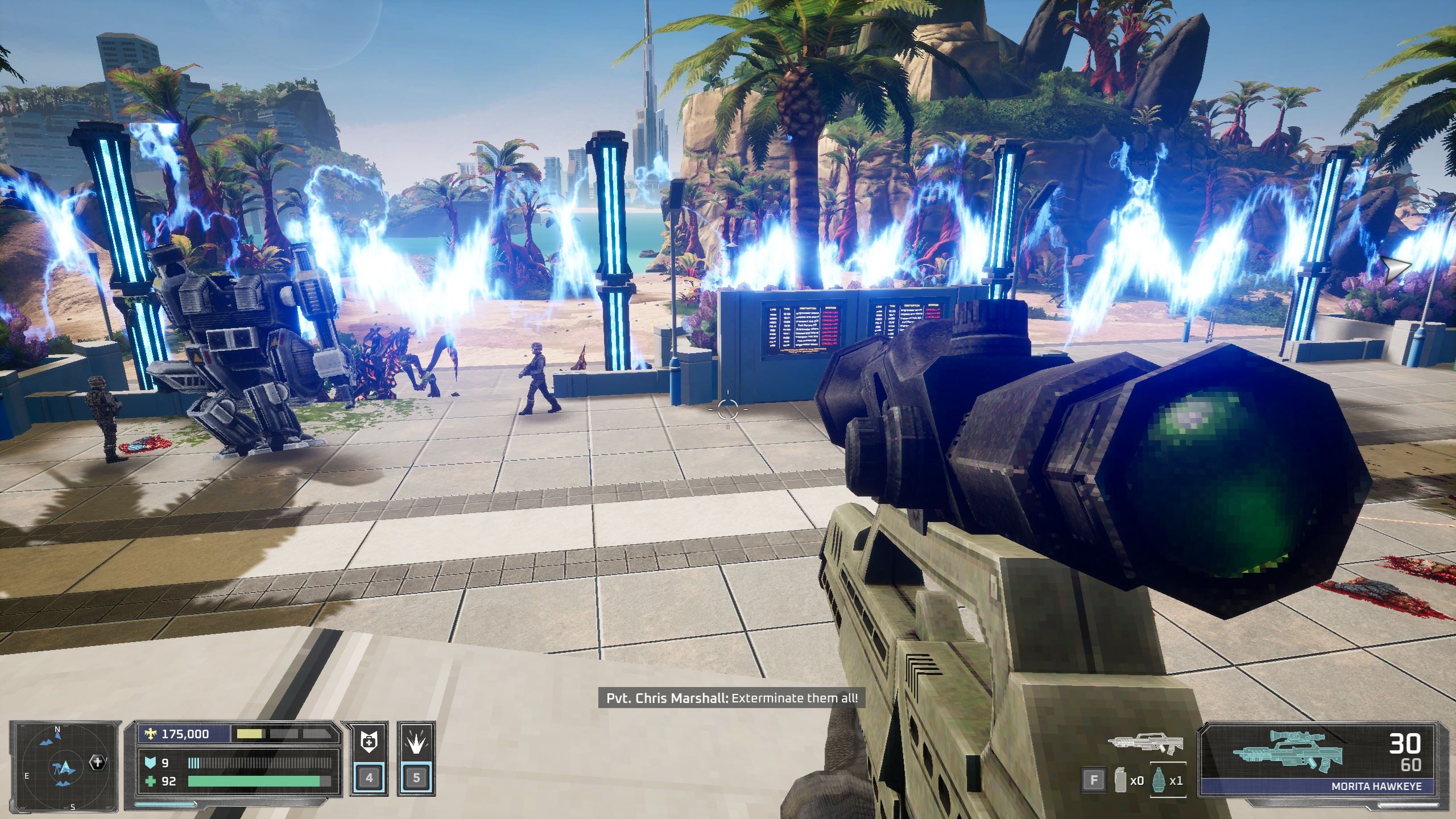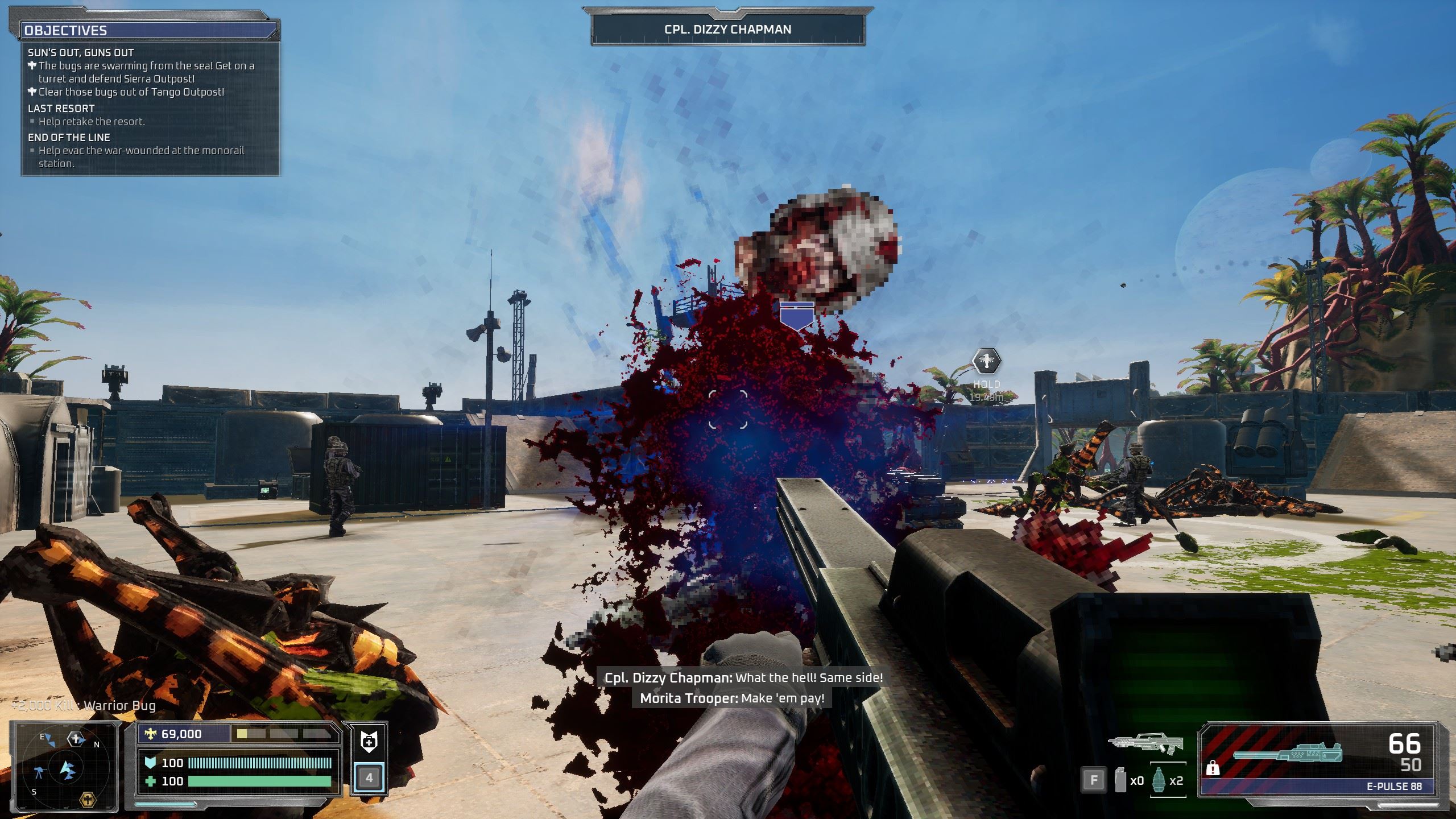Sortiment protivníkov obsahuje známe druhy arachnidov, medzi ktorými sú aj jedovaté chrobáky, tanker bug chrliaci oheň a ďalšia háveď prilieta zo vzduchu. Vo finálnej fáze misie sa na vás valia zo všetkých strán a je fuška to ustáť. Počas celej misie vás síce sprevádzajú aj iní vojaci Federácie ovládaní umelou inteligenciou, ale správajú sa totálne hlúpo. Ich streľba nemá prakticky žiadny účinok a namiesto poľovania na chrobáky vám lezú neustále do rany. Často som ich nechtiac zranil, potom som ich už vôbec nešetril, lebo jednoducho prekážali a kvôli nim som nemal čistý výhľad. Našťastie, hra (alebo aspoň demo) za to nedáva postihy.
