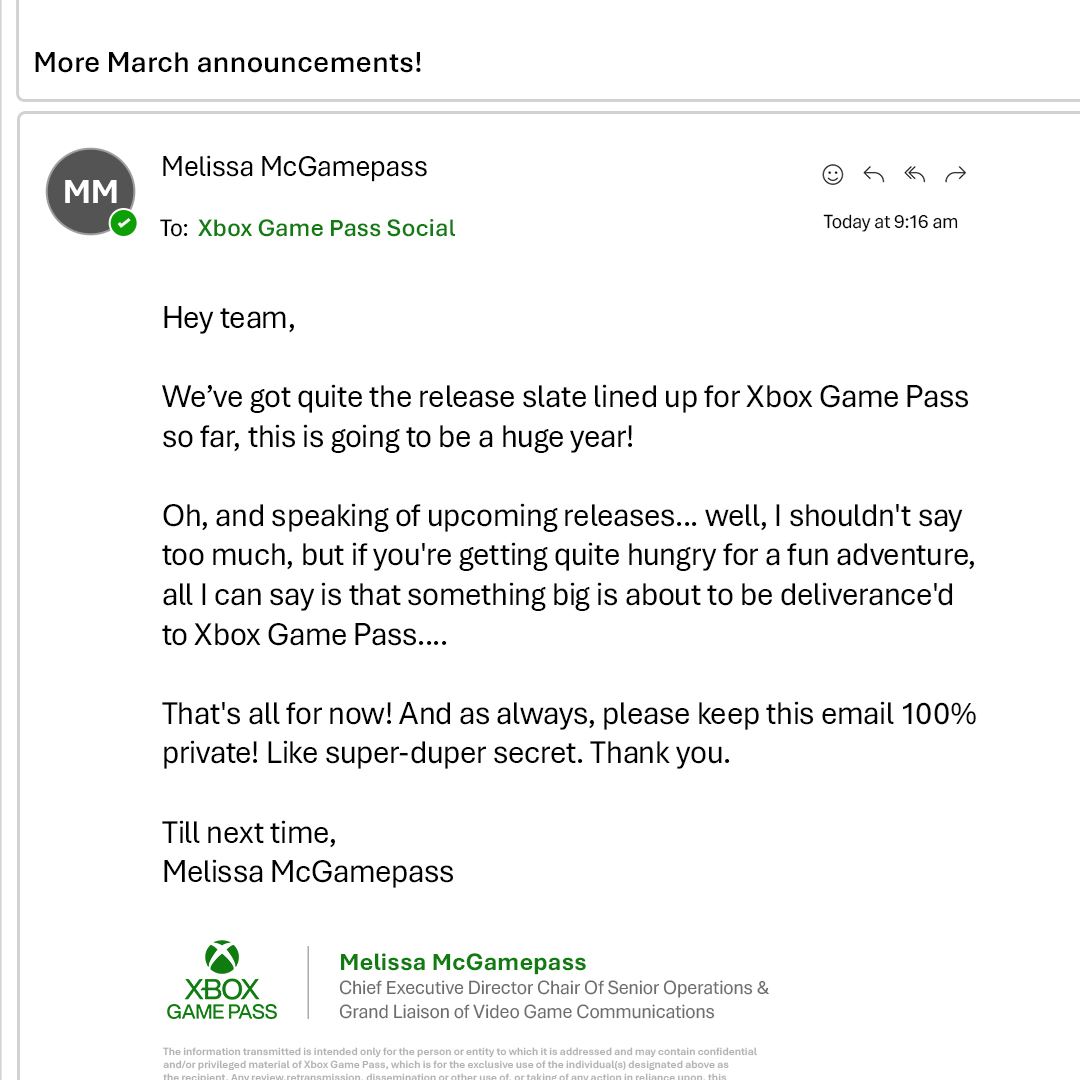 Po aktuálnom pridaní prvého Kingdom Come zrejme Microsoft plánuje pridať aj dvojku. Práve to odteasovala Melissa McPass, ktorá po dlhej dobe priniesla ďalší svoj zakódovaný mail. Spomína tam "deliverance'd"