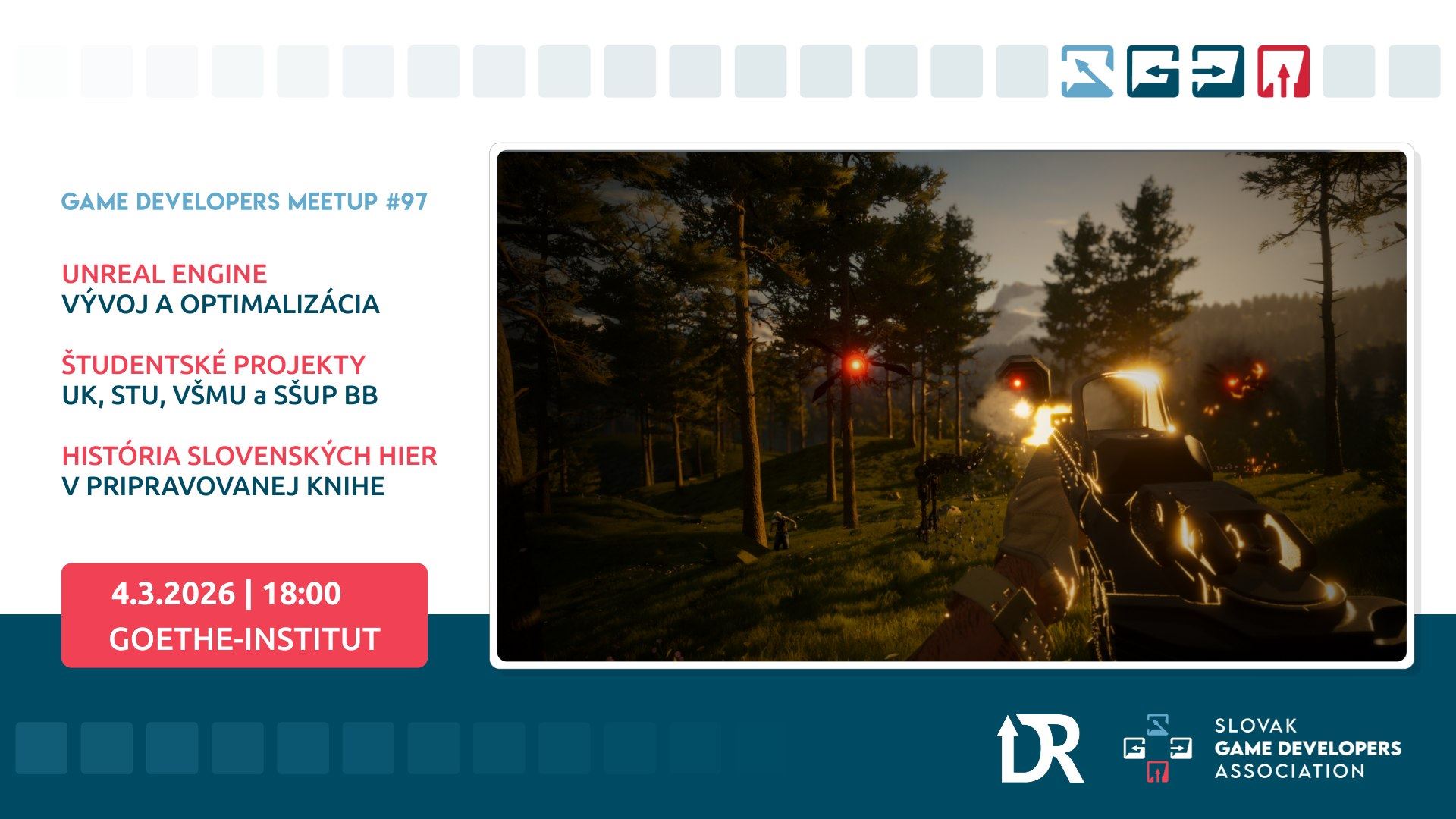Game Developers Meetup #97 sa 4. marca 2026 v Bratislave zameria na Unreal Engine, študentské hry a históriu slovenských hier.