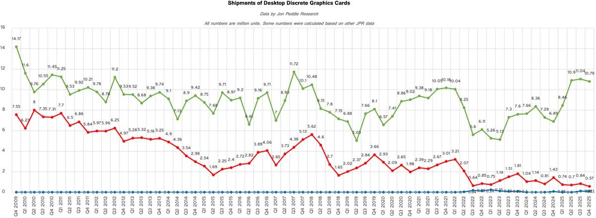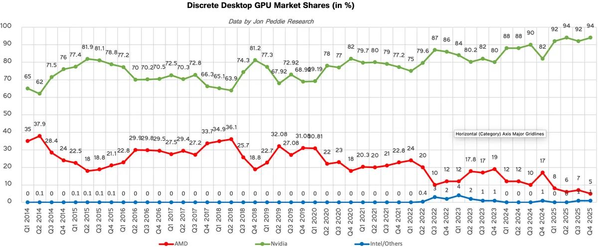 Podľa Jon Peddie Research Nvidia v roku 2025 zvýšila podiel na desktopových GPU na 94 až 95 percent, AMD kleslo na 5 percent.