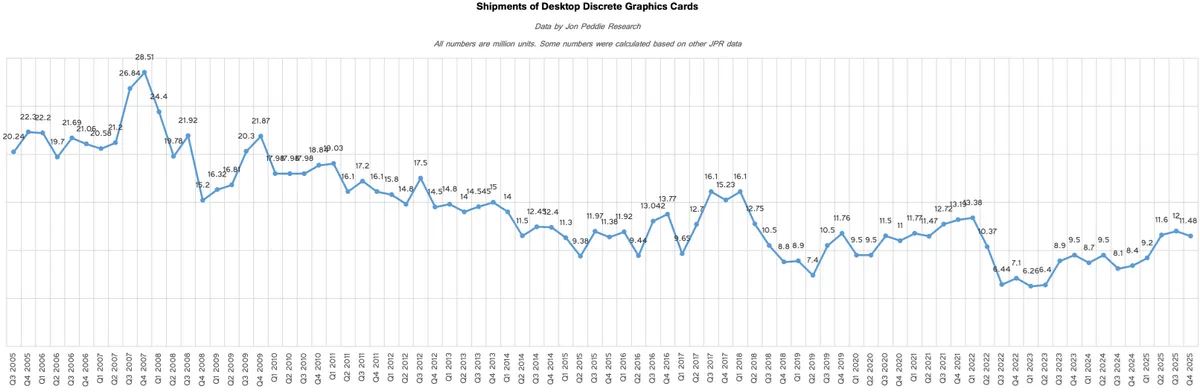 Jon Peddie Research zároveň upozorňuje, že aj keď rok 2025 priniesol rast, situácia na trhu zostáva neistá. Segment grafík tlačia z jednej strany výkonnejšie notebooky a integrované grafiky v procesoroch, z druhej zase rast cien, drahšie GDDR pamäte, napätie medzi ponukou a dopytom aj colná neistota v USA. Práve preto analytici očakávajú, že trh desktopových grafických kariet by mohol v roku 2026 medziročne klesnúť približne o 10 percent.