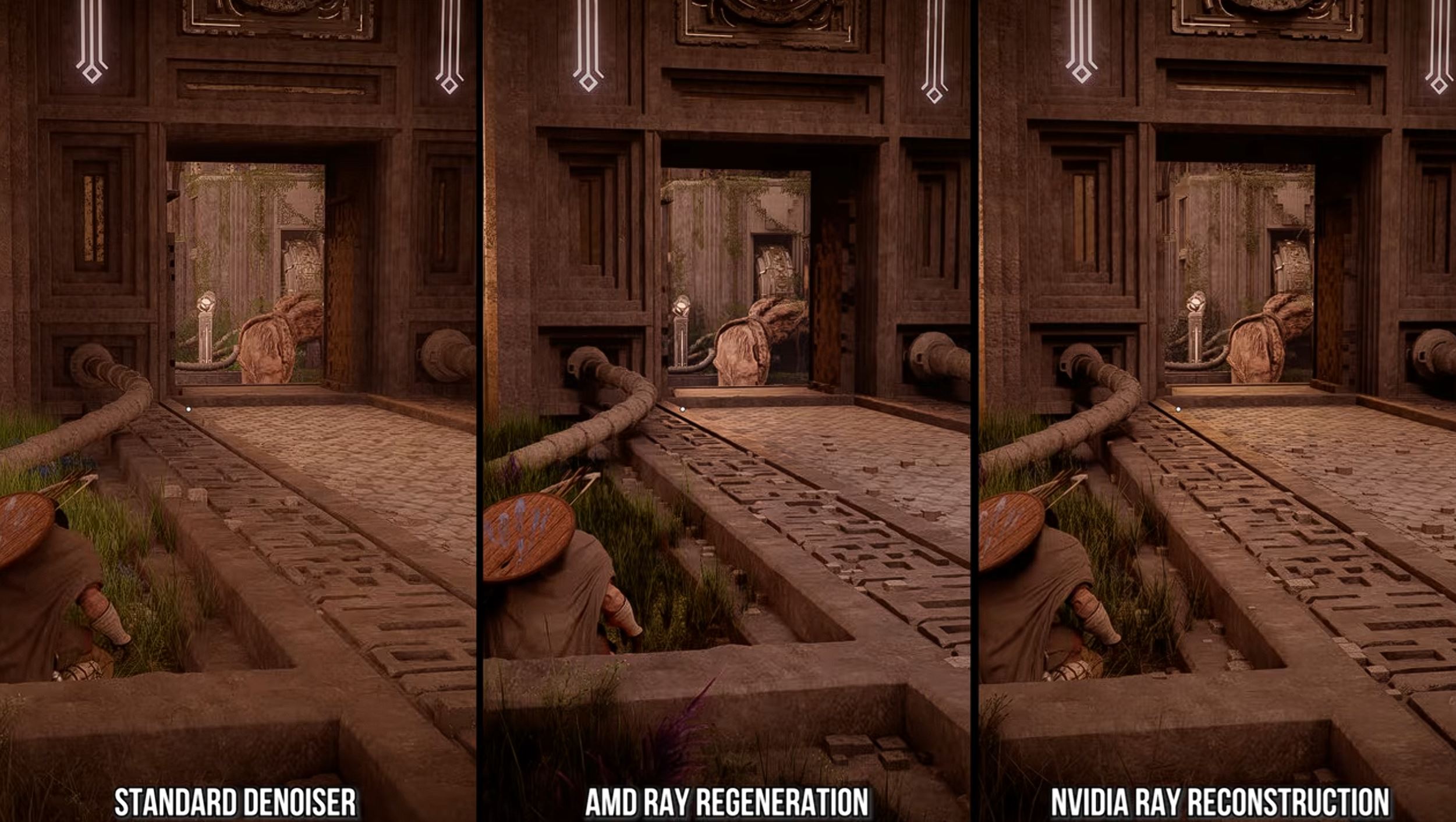 Na PC sa však dajú zapnúť pokročilé ML riešenia, konkrétne AMD ray regeneration a Nvidia ray reconstruction, ktoré podľa videa výrazne zlepšujú kontaktné tiene, smerovanie svetla, kontrast scény aj stabilitu obrazu. Rozdiel má byť natoľko veľký, že pôsobí skoro ako prepnutie ray tracingu z vypnutého do zapnutého stavu.