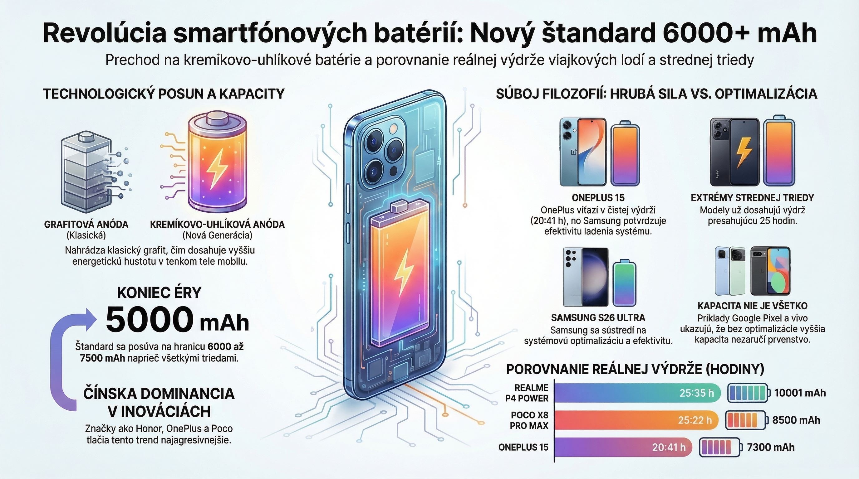 Ak sa na tieto výsledky pozrieme ako na celok, jedno je zrejmé. Hodnoty 6000 až 7500 mAh už prestávajú byť raritou. V hi-ende ich reprezentujú modely ako Honor Magic8 Pro, Xiaomi 17 Ultra či OnePlus 15. V strednej a vyššej strednej triede zas Honor Magic8 Lite, Poco X8 Pro, Redmi Note 15 Pro+, Oppo Reno15 alebo OnePlus 15R. Práve to je možno najdôležitejší signál. Nejde len o pár výstrelkov, ale o trend, ktorý sa rozlieva naprieč celým trhom.