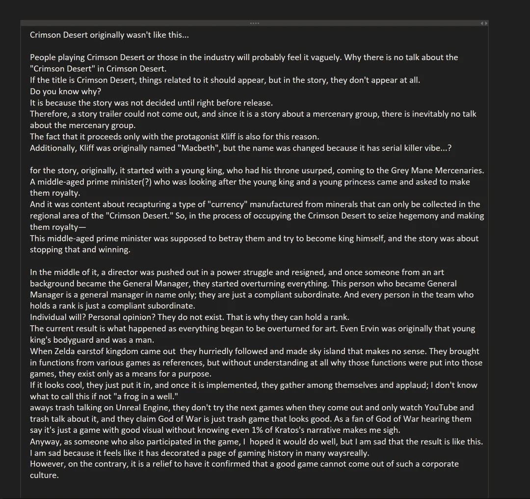 Crimson Desert po vydaní čelí ďalšej vlne kritiky. Objavili aj anonymné výpovede vývojárov, ktoré naznačujú vážne vnútorné problémy počas vývoja. Podľa nich sa hra postupne zmenila na nesúrodý mix nápadov a funkcií bez jasného smerovania.