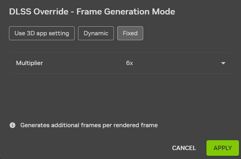 S príchodom DLSS 4.5 Dynamic Multi Frame Generation pribudlo aj nové rozdelenie režimov. Používateľ si teraz v NVIDIA App vyberá medzi Dynamic a Fixed. Režim Fixed funguje rovnako ako doterajšie Multi Frame Generation nastavenia, teda drží zvolený pevný násobič. Dynamic ho mení automaticky podľa situácie. V kompatibilných hrách je možné pri Dynamic režime aktivovať až 6X Multi Frame Generation, pri bežnom Multi Frame Generation ostáva 4X a 6X je dostupné len vo vybraných tituloch s novšími .dll súbormi Frame Generation.