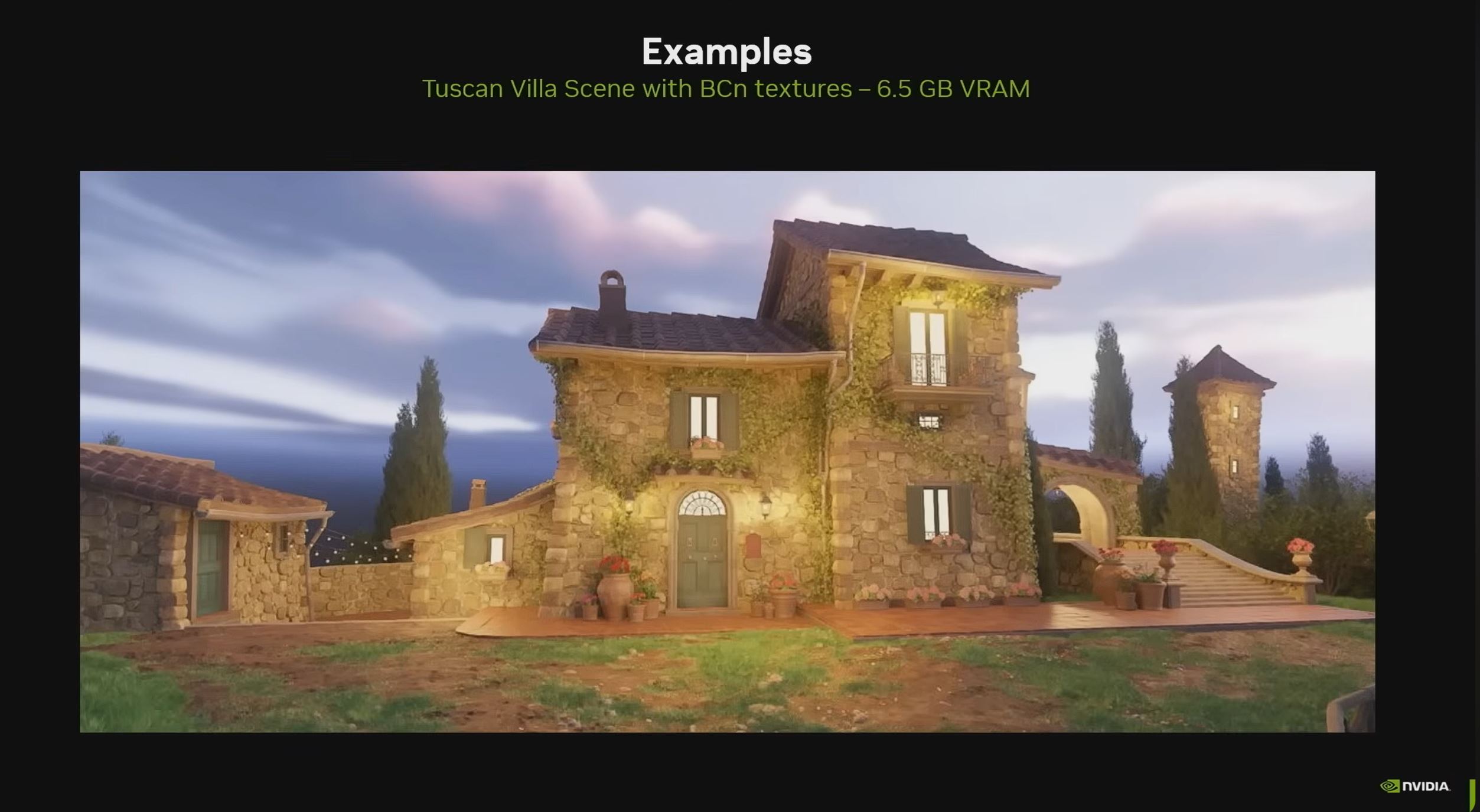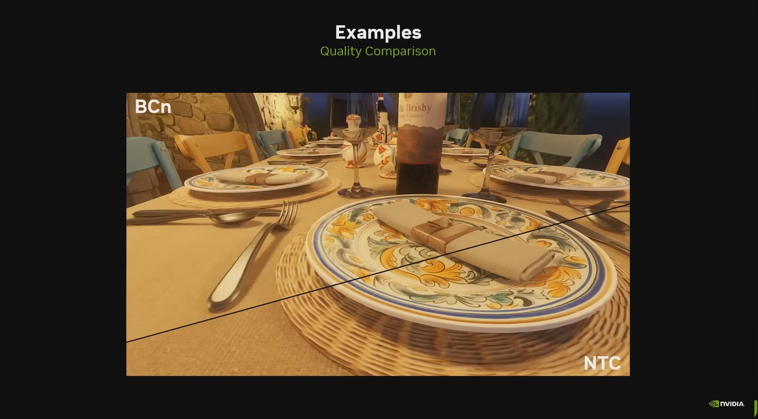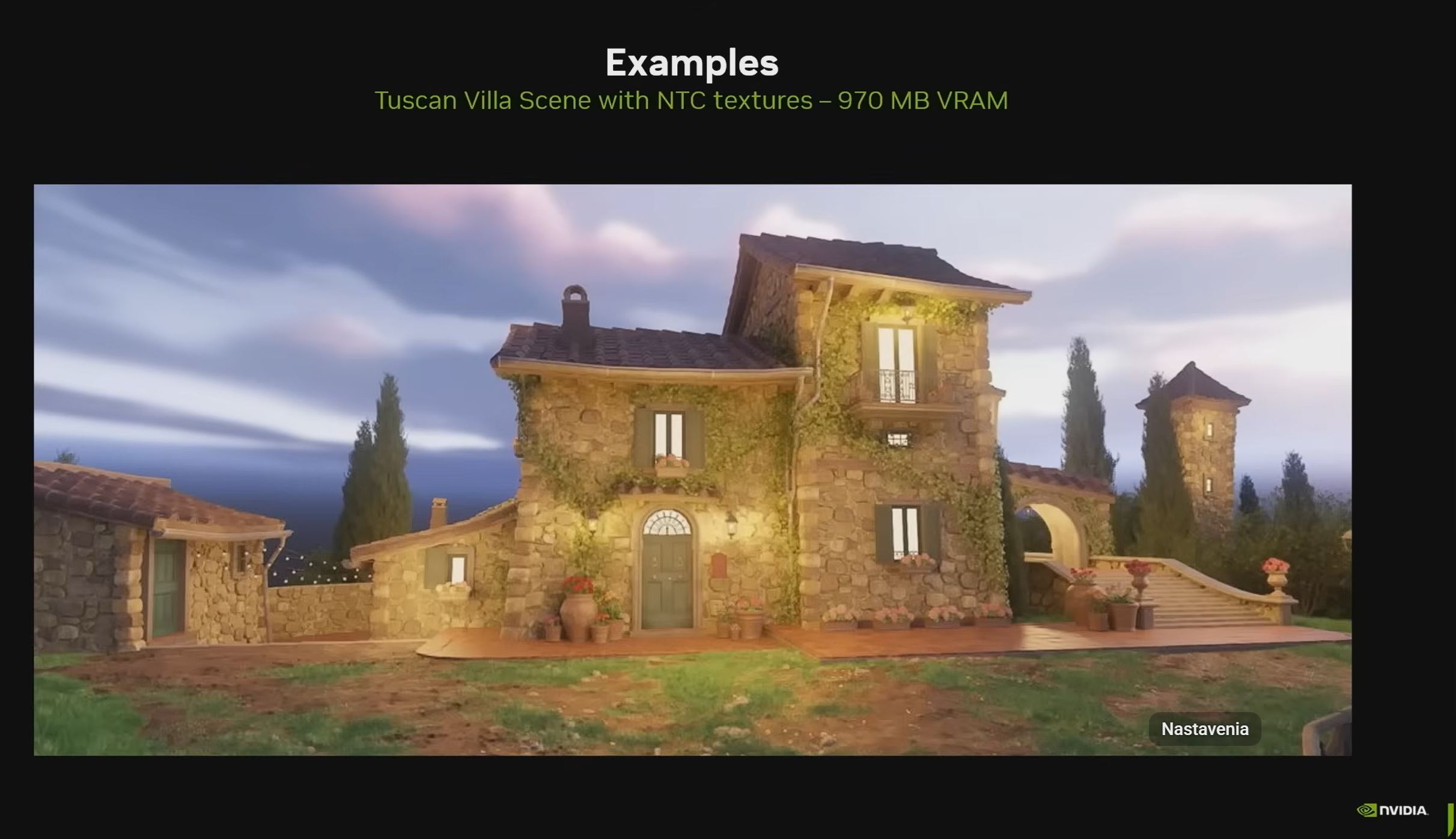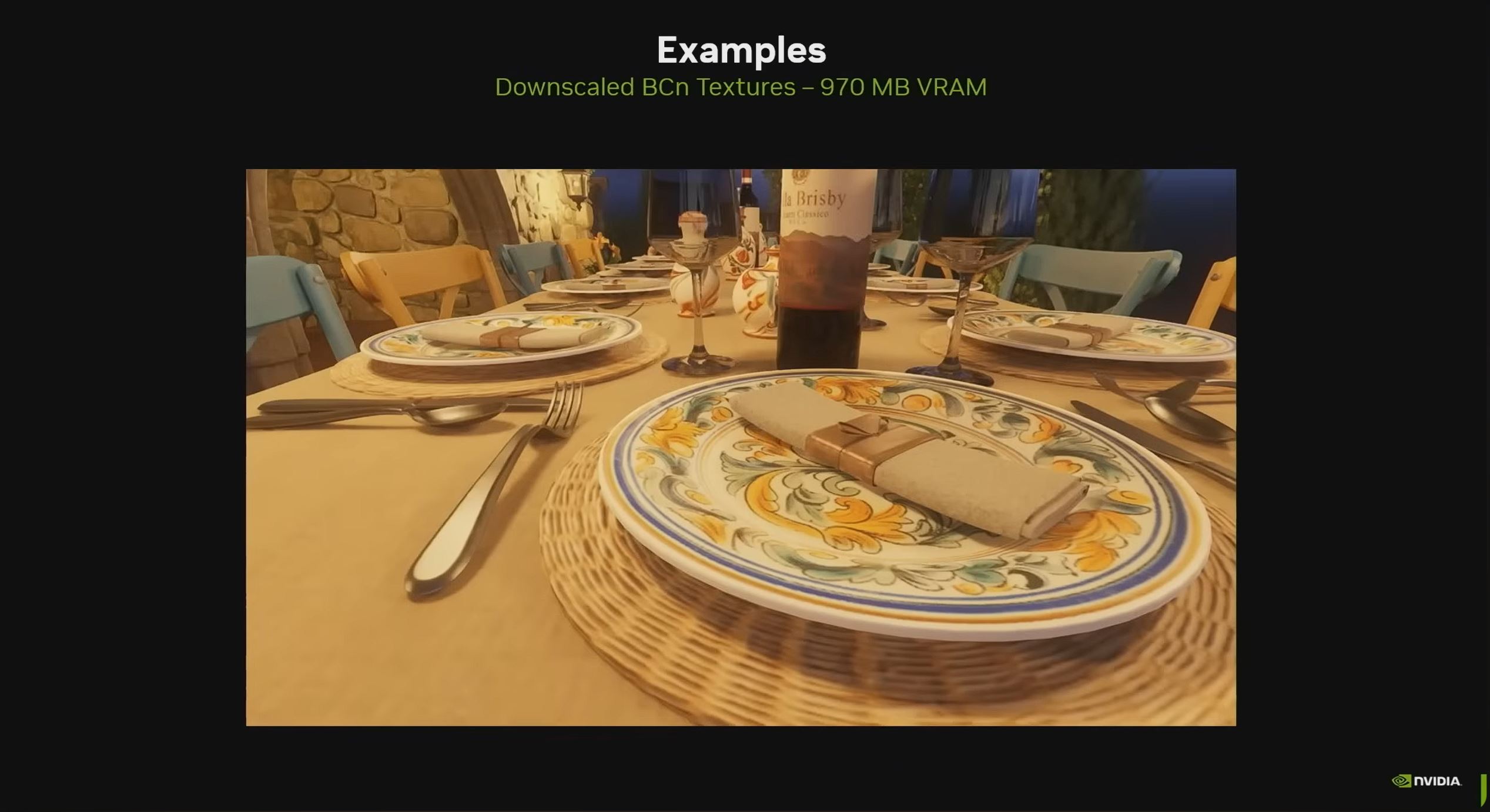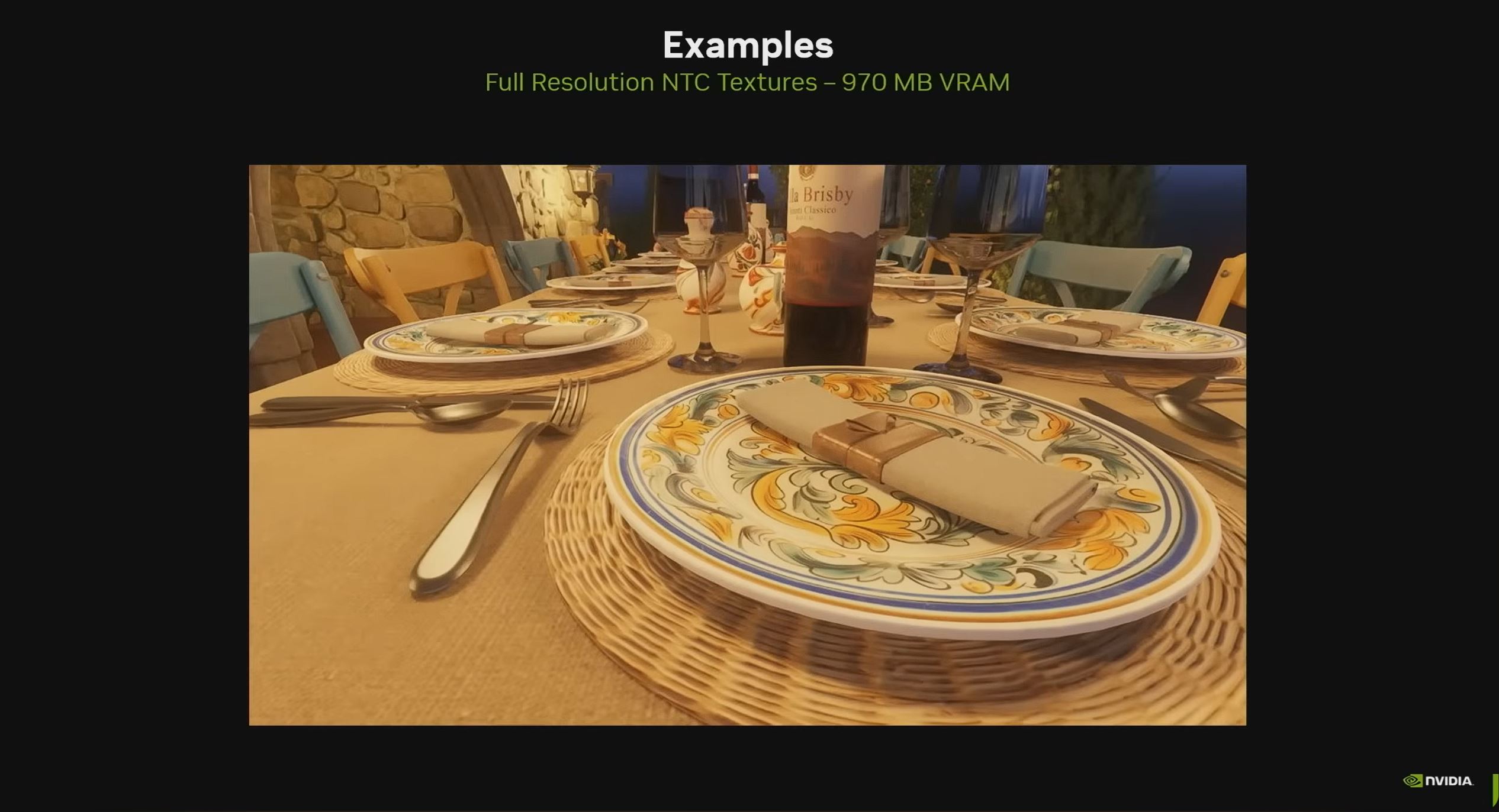 V ukážke bola rovnaká scéna najprv renderovaná s klasickou BC kompresiou textúr a podľa prezentácie sa celá zmestila približne do 6,5 GB VRAM. - Len 970 MB VRAM po zapnutí Neural Texture Compression