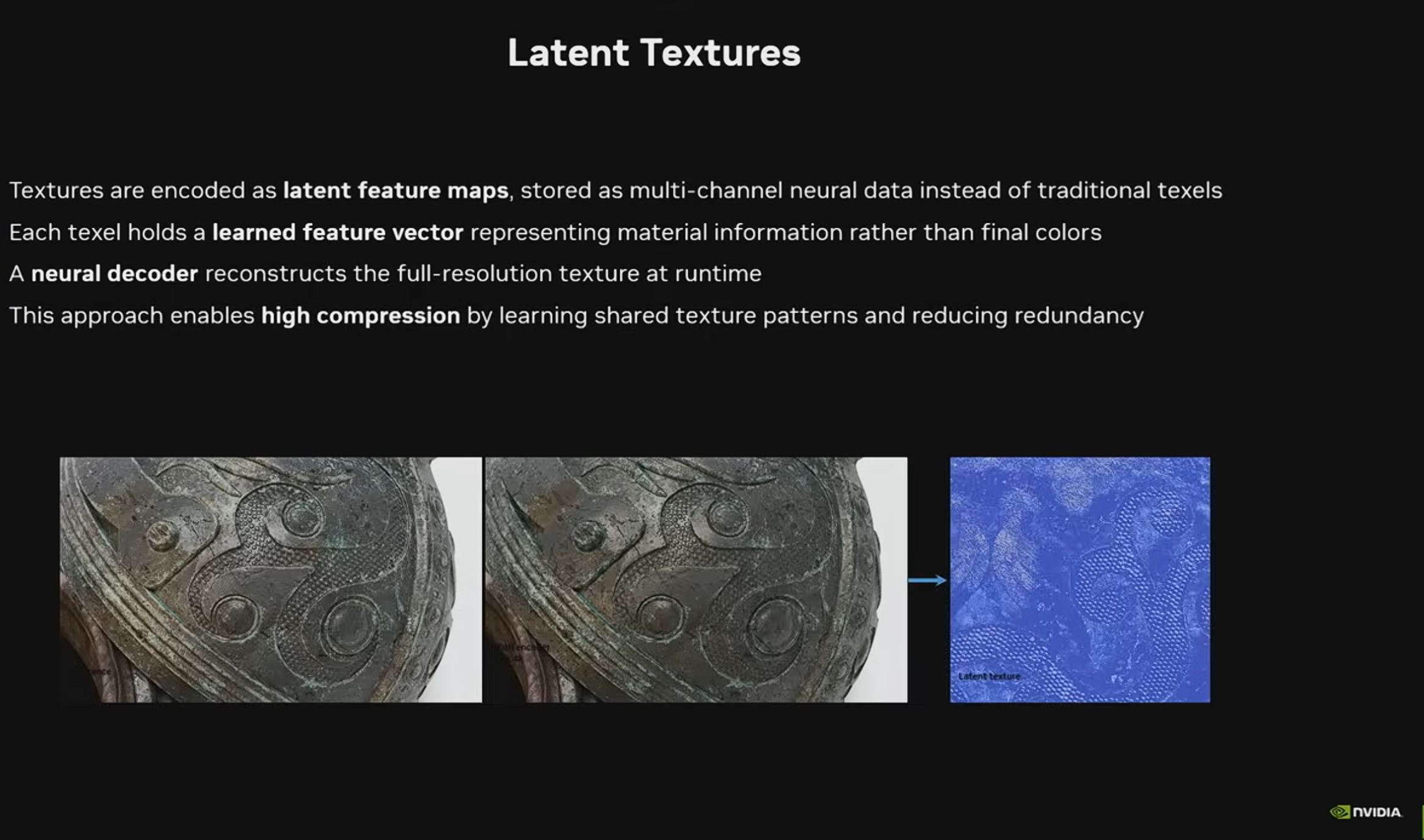Nvidia ponúkla prezentáciu Neural Texture compression, kde ukázala vysokú efektivitu kompresie bez straty kvality.