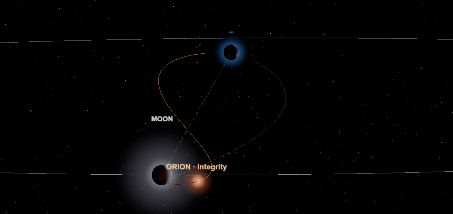 Orion práve oblietava Mesiac, po polnoci sa dostane za jeho odvrátenú stranu a zamieri späť k Zemi |