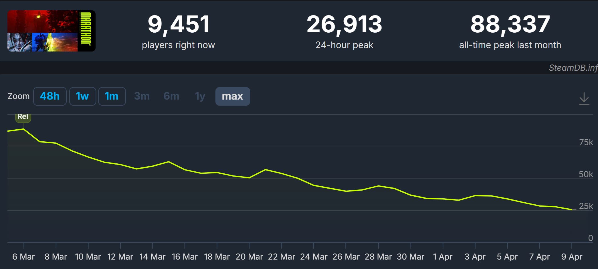 Marathon má väčšinu hráčov na PC a konkrétne na steame, kde vidíme pomaly ale isto sa znižujúce čísla. Zatiaľ sa nezdá, že by firma mala pripravený update, ktorý do v dohľadnej dobe dokáže zvrátiť.