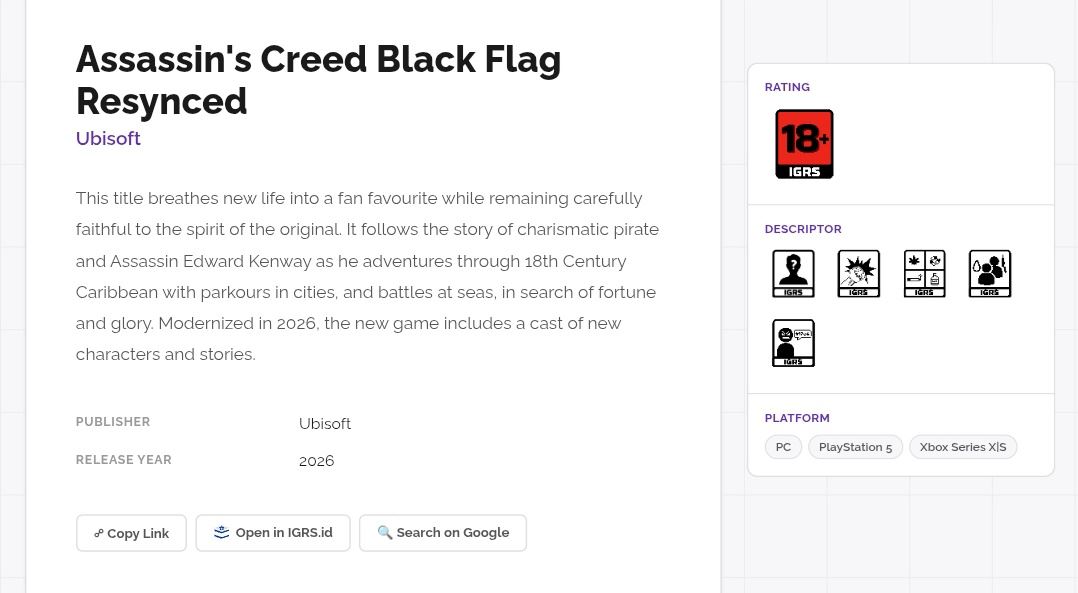 Assassin’s Creed Black Flag Resynced sa znovu objavilo v úniku, tentoraz cez indonézsky rating systém IGRS, čo ďalej posilňuje dojem, že návrat Black Flag je už len otázkou času. Podľa uniknutého popisu má nová verzia „vdýchnuť nový život fanúšikmi obľúbenej hre“, no zároveň zostať verná duchu originálu. Znovu sa tak má sústrediť na príbeh Edwarda Kenwaya, piráta a asasína, ktorý sa pohybuje v Karibiku 18. storočia, kombinuje parkour v mestách s námornými bitkami a hľadá slávu aj bohatstvo.