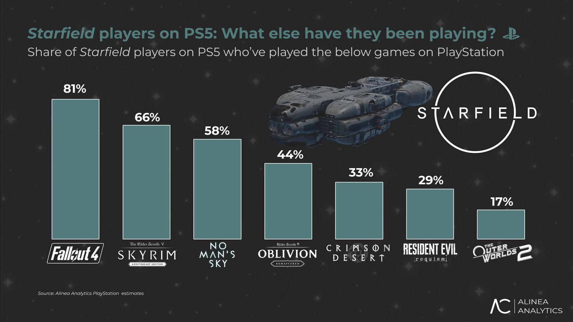 Podľa odhadov Alinea Analytics sa Starfield na PS5 počas prvého týždňa predalo približne 140-tisíc kópií, čo malo priniesť asi 7,7 milióna dolárov v hrubých tržbách. Hra tak na novej platforme nezačala zle, ale ani nie veľkolepo.