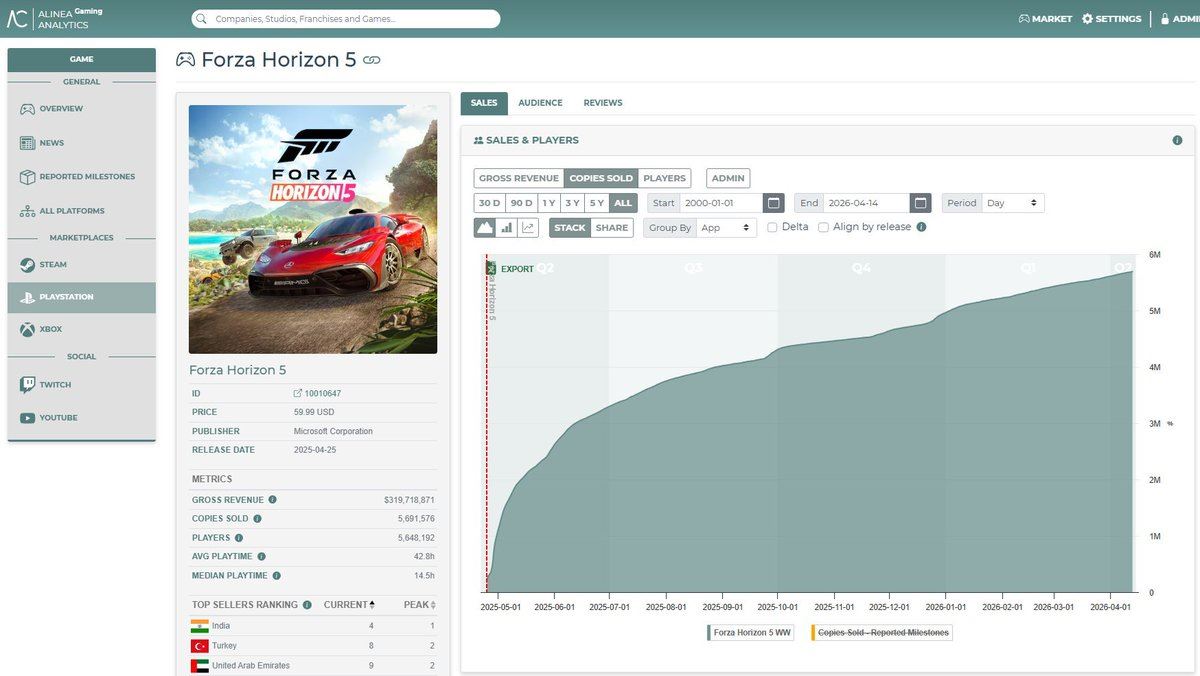 Čo sa týka tržieb a predajov Xbox hier na PS5, masívne to tam ovládla Forza, ktorá podľa odhadov predala 5.7 milióna kusov s tržbami 400 miliónov: