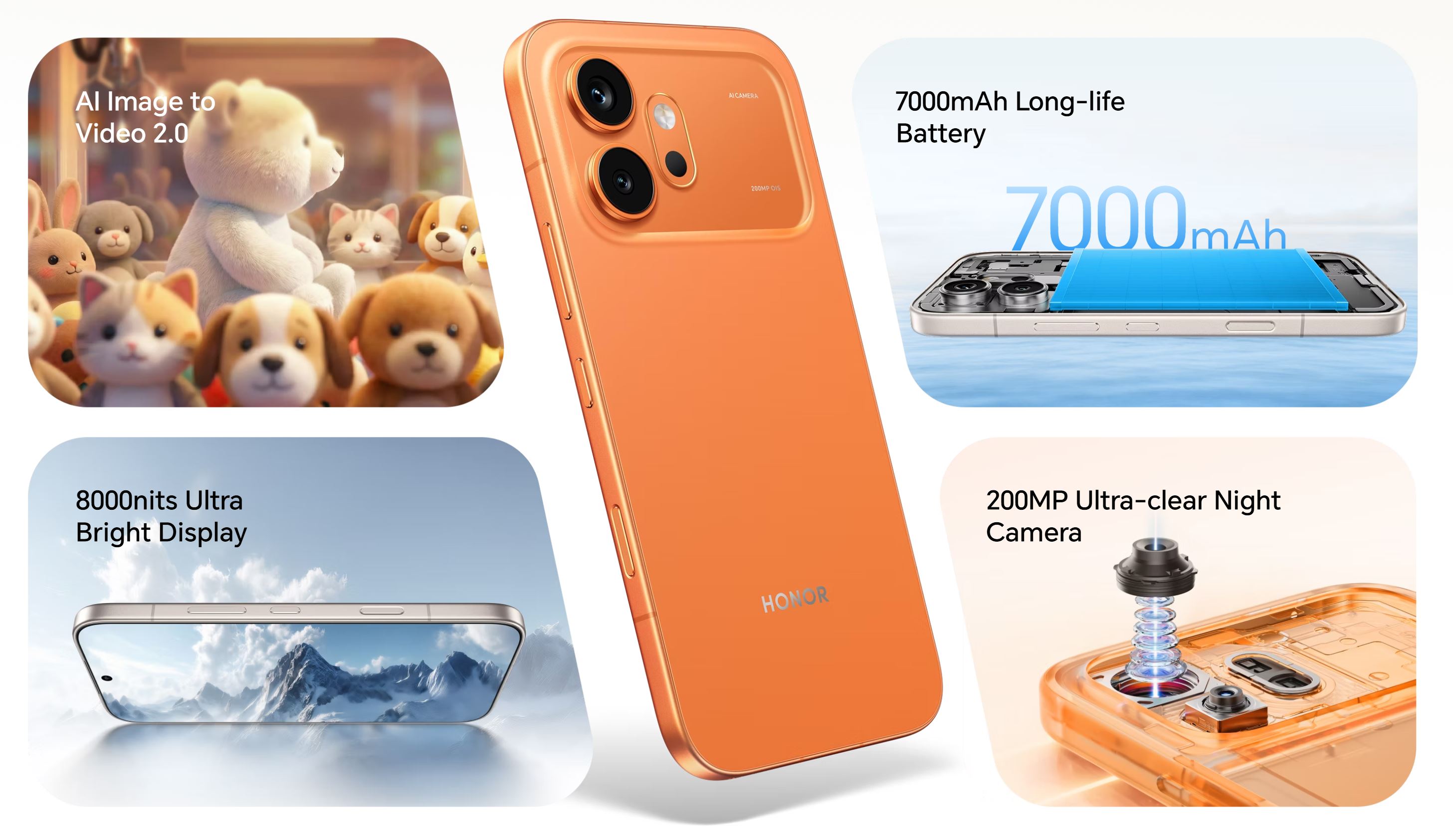 Hlavným ťahákom novej série je AI Image to Video 2.0. Táto funkcia umožňuje z kombinácie až troch obrázkov a textových pokynov vytvárať krátke 3 až 8-sekundové videá. HONOR k tomu pridáva aj AI tlačidlo pre rýchly prístup k tvorbe videí z galérie a AI Photos Agent, ktorý má zvládnuť úpravy fotografií cez jednoduché textové príkazy. Súčasťou výbavy sú aj nástroje na prácu s pohyblivými fotografiami, vrátane mazania objektov a tvorby koláží.
