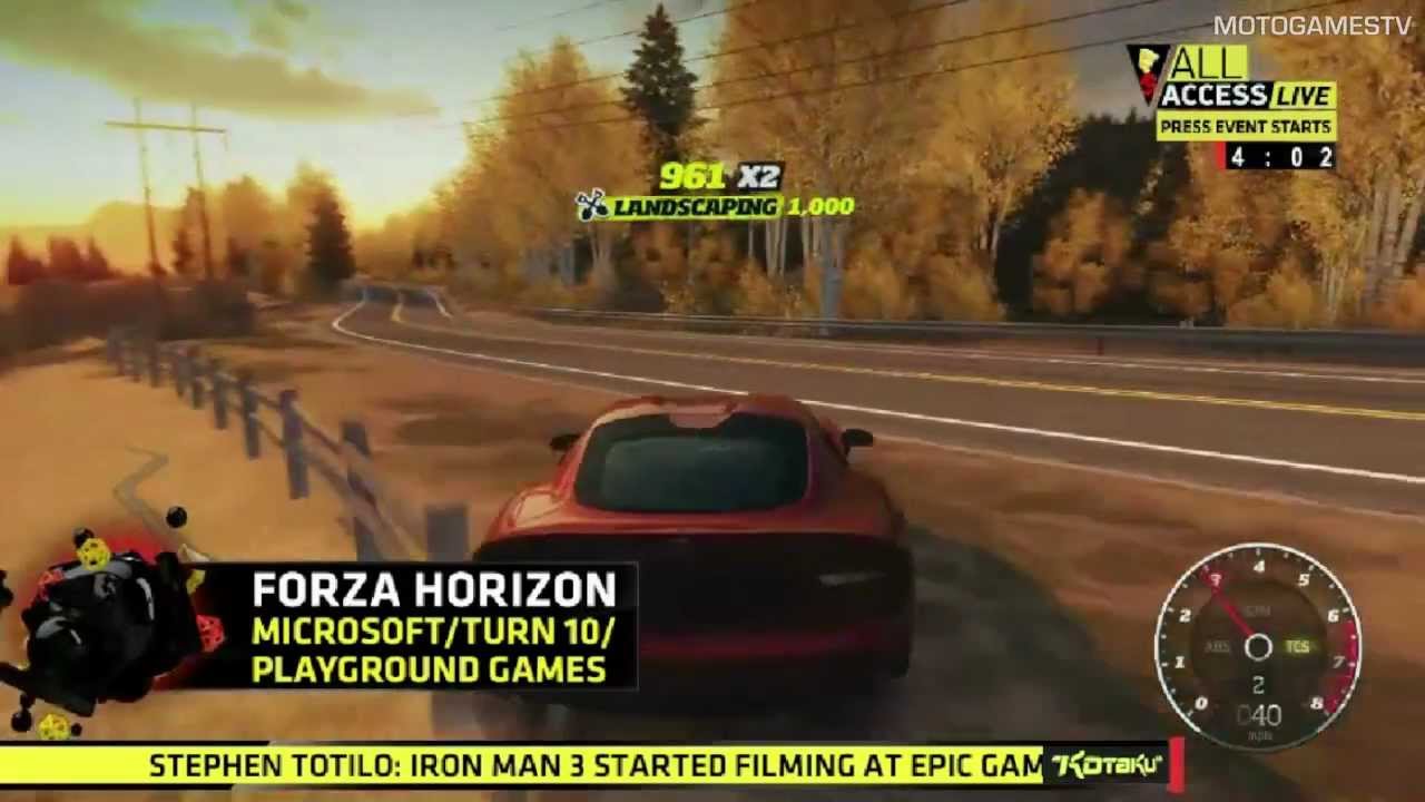 Síce na Microsoft press konferencii sme videli len trailer na Forza Horizon, prezentácie v na výstave nám hru približujú. Playground Games si v hre požičali celý engine od Turn 10, zachovali 360 fps fyzikálny model, rozšírili cesty, rozšírili typy vozidiel a pridali zábavu.