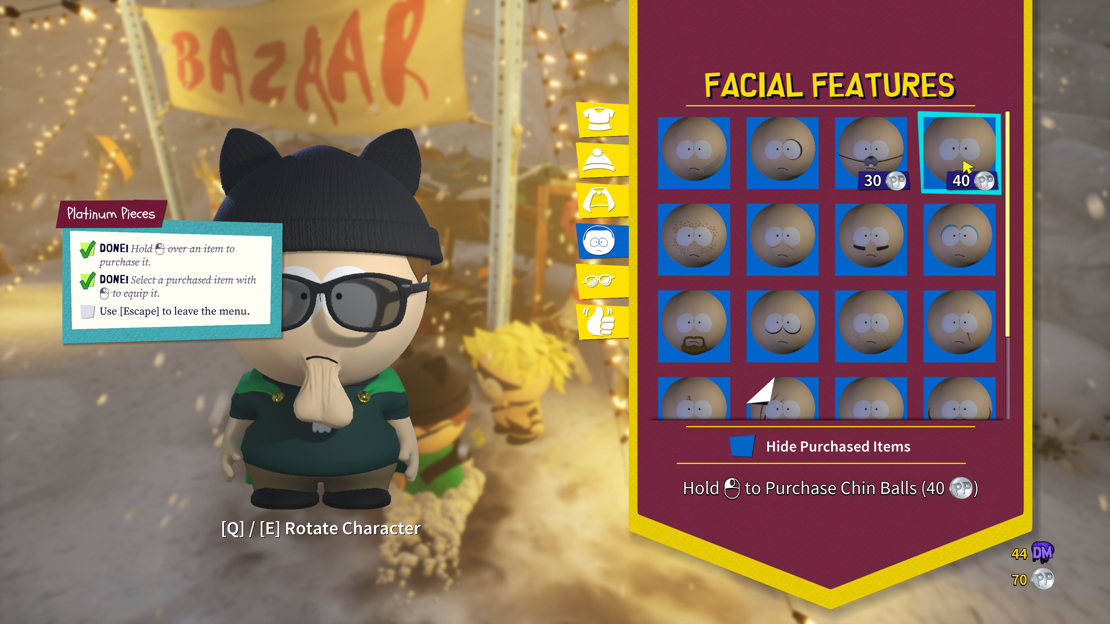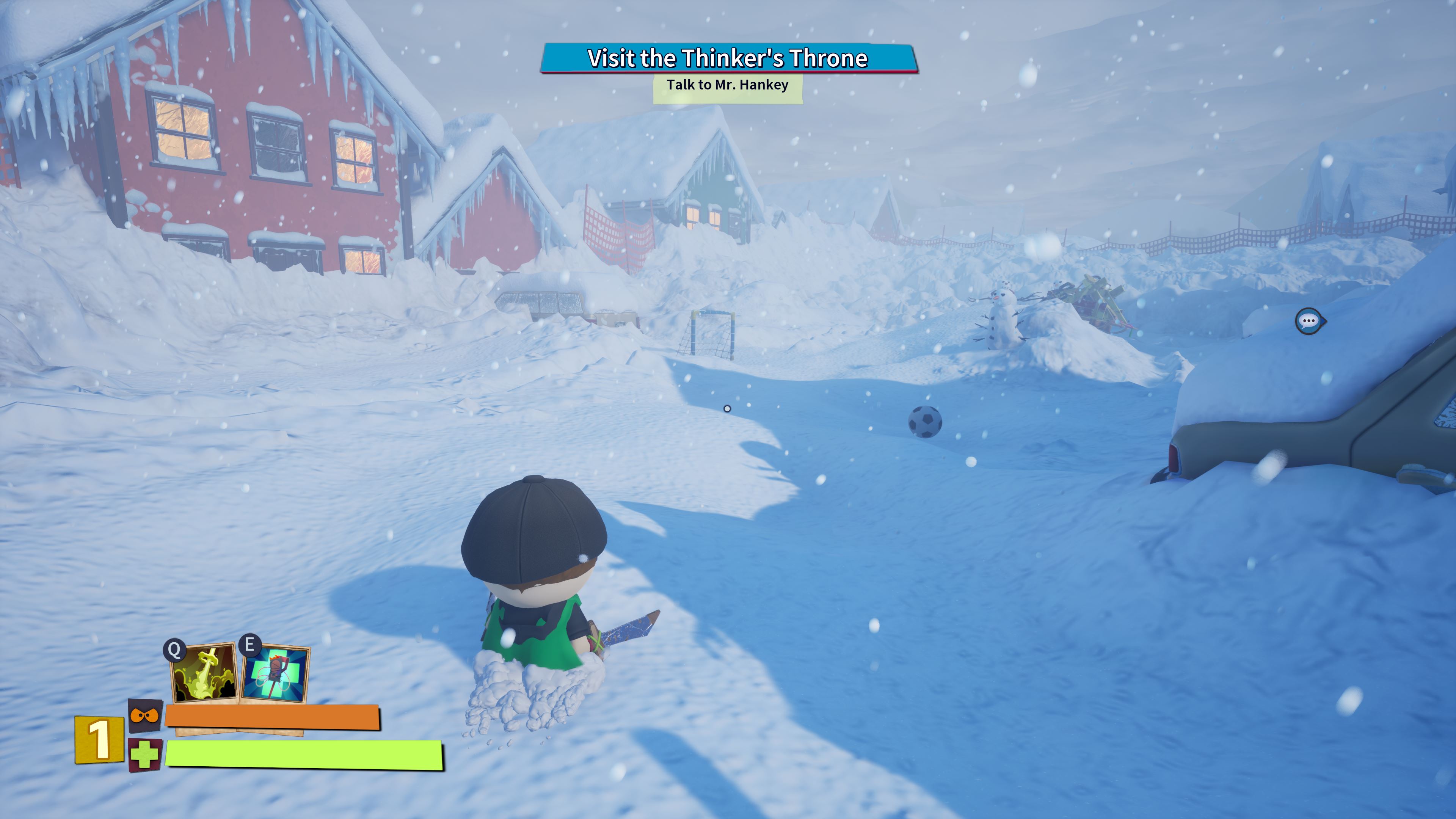 South Park určite väčšina z vás pozná. Z ničoho nič sa v príbehu udiala snehová kalamita nevídaných rozmerov, ktorá pre dospelých znamená hrôzu, des a peklo. No pre deti zo základnej školy to znamená jediné – voľno zo školy! Hurá! A teda ako to už v detskej predstavivosti býva, ľahko si na túto udalosť vymysleli zábavu. Idú sa hrať von a vyriešiť problém so snehom. Môže za to Kyle a jeho elfovia (prváčikovia)? Môže za to Kenny v oblečení princeznej , Stan alebo dokonca Eric Cartman? Kto? Nech je to ktokoľvek, vyriešiť to v spolupráci s ostatnými musí nový chlapec – vy! Takže nastáva editor postavy, ktorý je pomerne skromný, ale môžete si tam v zásade vytvoriť dizajn od výmyslu sveta. A hor sa do hry.