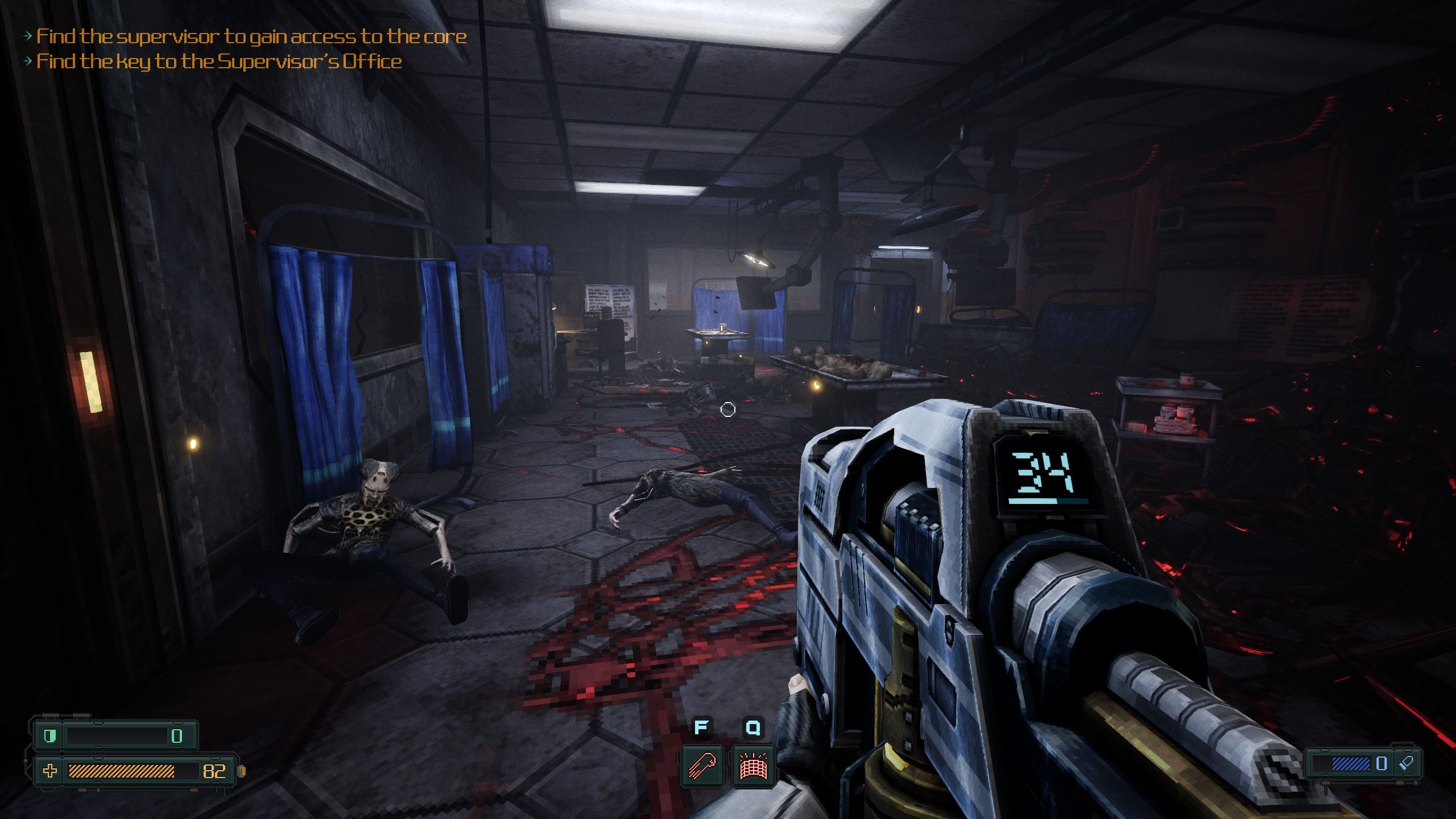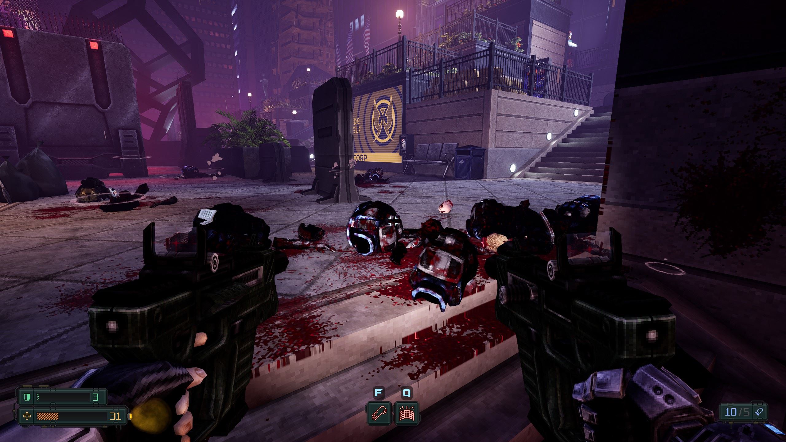 Zdravie si dopĺňate predovšetkým okamžite použitými nealko nápojmi v plechovkách. Príležitostne ich nájdete na stoloch popri iných nápojoch a jedlách a tie sa tiež sa dajú vypiť a trochu pomôžu. Najčastejšie ale získate sódu z automatov po stláčaní tlačidiel. Oceníte nálezy brnenia, vďaka ktorému viac vydržíte. Príležitostne sú naokolo malé výstrednosti v štýle Duke Nukema, takže môžete splachovať záchody, použiť guľôčkový automat, rozstrieľať akvárium a podobne. Len škoda, že hlavná hrdinka nie je taká urečnená ako Duke. Hlášky v podobnom duchu, samozrejme, v ženskom prevedení, by veľmi pekne dotvorili postup.