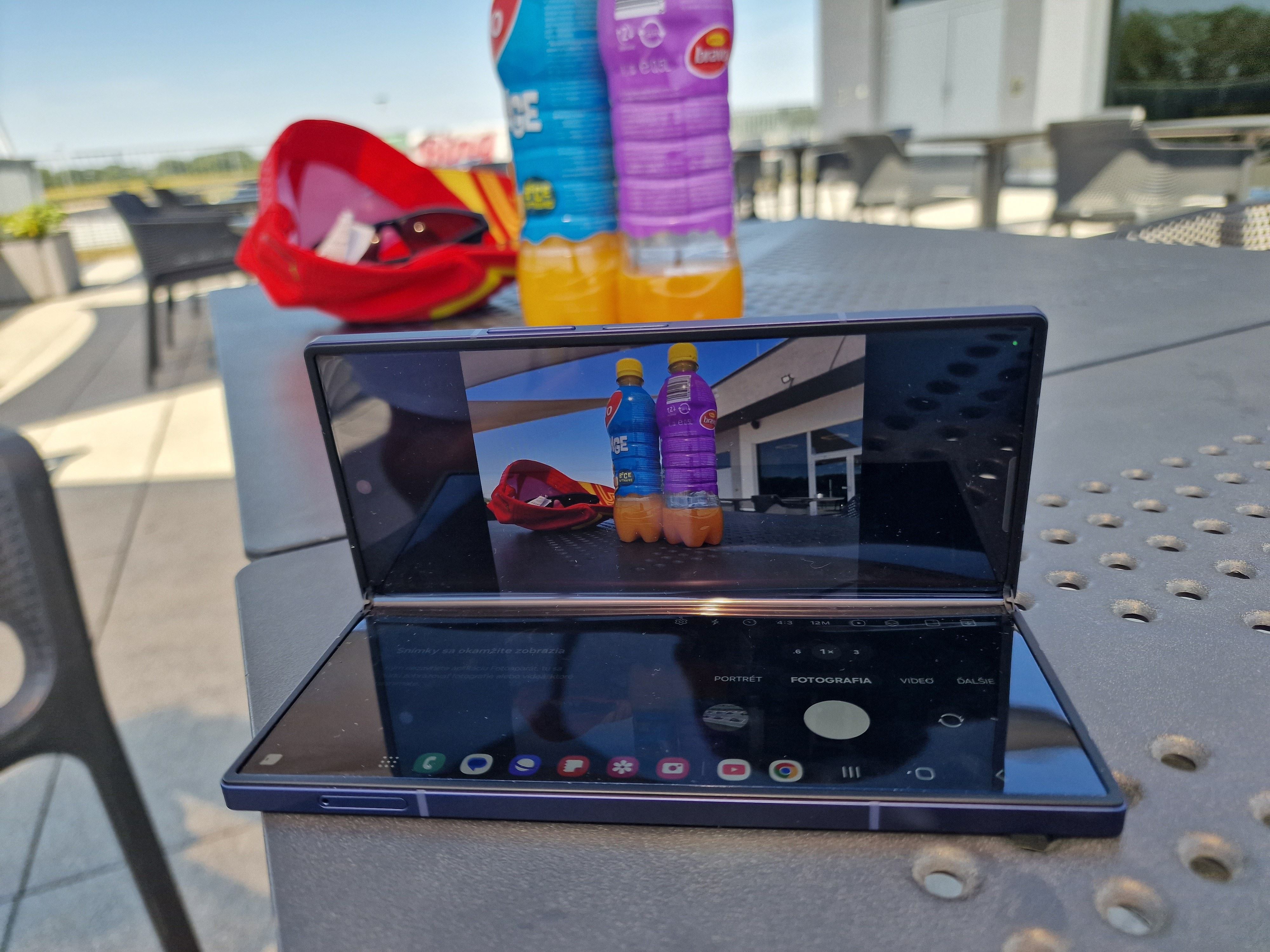 Samozrejme, hlavné kamery môžete používať štandardne s použitím ako vnútorného, tak predného displeja. Pričom vnútorný viete použiť aj ako statív a keď mobil ohnete, foto aplikácia sa vám rozdelí na dve časti, kde hore máte záber z kamery, dole galériu a nastavenia. Môžete si takto mobil niekde položiť a bez nutnosti držania natáčať. To je už základná funkcia od prvého Foldu.