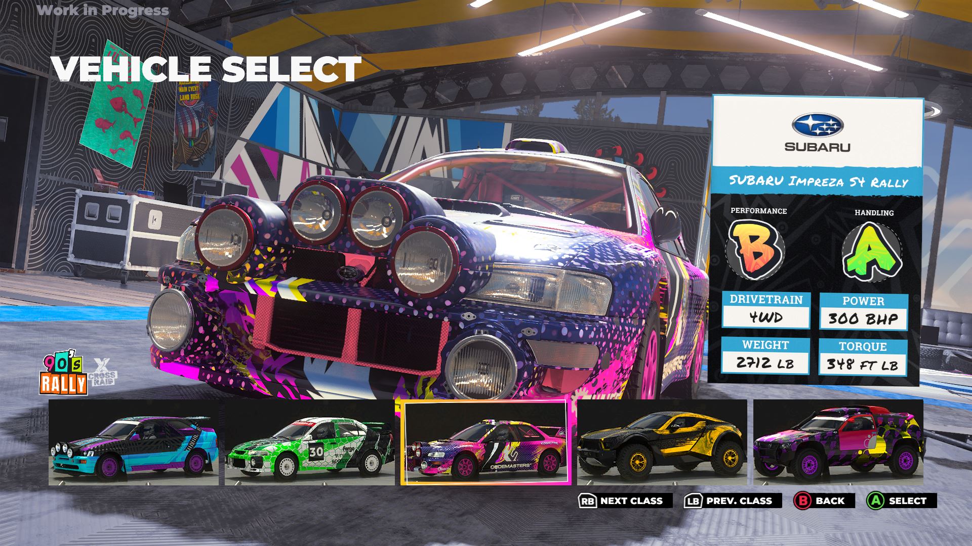 Nielen kariéra, ale celá hra ponúkne 7 tried vozidiel, pričom v niektorých triedach bude aj viac kategórií. Typickým príkladom je rally trieda, kde nájdete klasiky, ikony 90. rokov, ale aj moderné rally autá. Nechýba tak Mustang Fastback, RS200, Lancer Evo VI, Polo GTI R5, 208 WRX alebo 911RGT. Každé z nich reprezentuje inú triedu, každé je ikona. Ariel Nomad Tactical zas reprezentuje Superlite triedu, Laffite X-Road je zástupcom Cross raid, Jimco Class 1 Hammerhead je zas parádna bugina, v Rock Bouncer sérii si zajazdíte vo WS Auto Racing Mudclaw, Jupiter Hawk 410 je 900 koňová beštia na šprinty, no a nájdete tu aj Formula Offroad sériu.